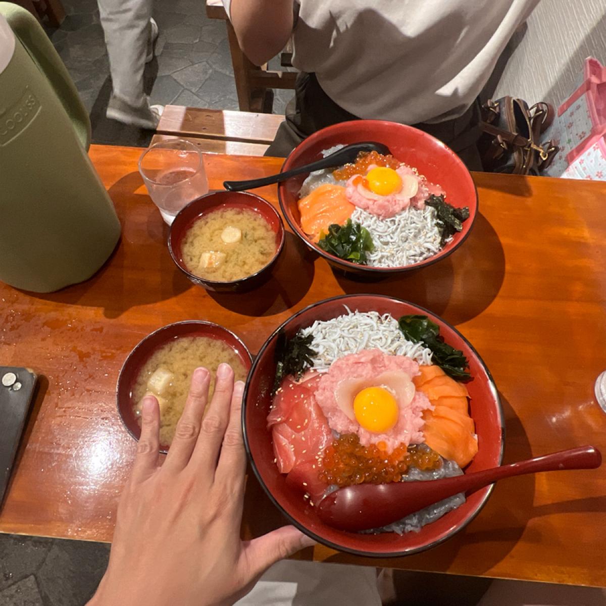 The boss said that if we didn't know what to order, they have king size and queen size assorted rice bowls. If you want to try various types of fish, it's recommended to order the assorted rice bowl. Since we honestly found it hard to decide, we ordered both a king and a queen size bowl. When they arrived, we were surprised by the huge portions; I even took a photo next to a coin for comparison.