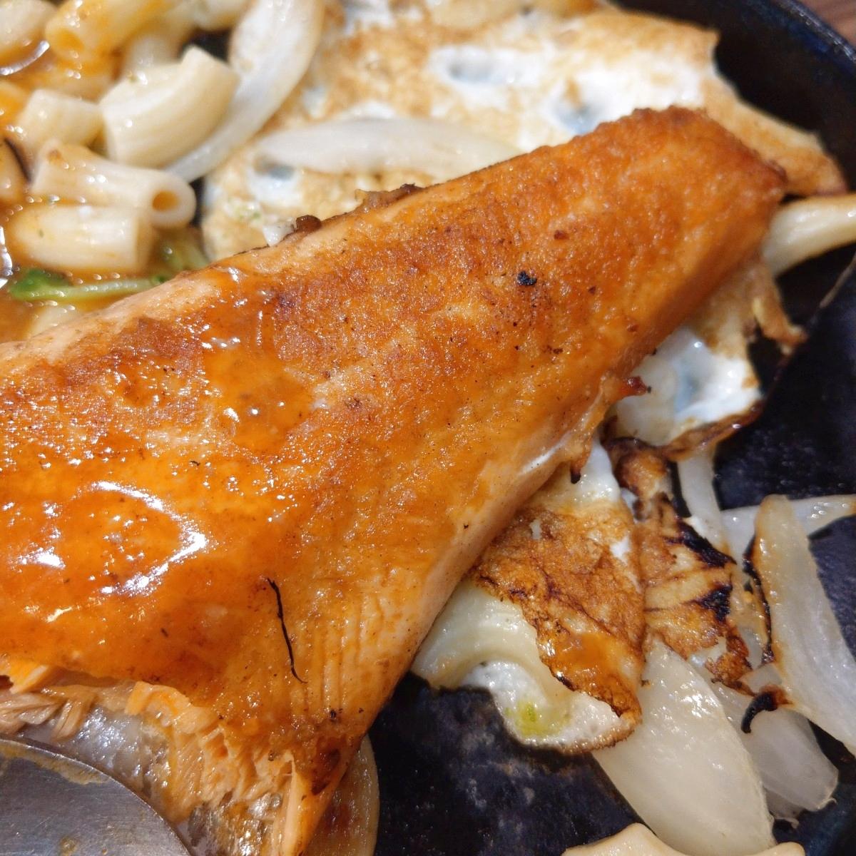Norwegian Salmon Fillet: This dish is served with macaroni, and the other ingredients are the same, with just one or two extra leaves. The salmon is pretty good, though it is a little bit dry due to the cut, but thankfully, it has no bones, making it easy to eat.