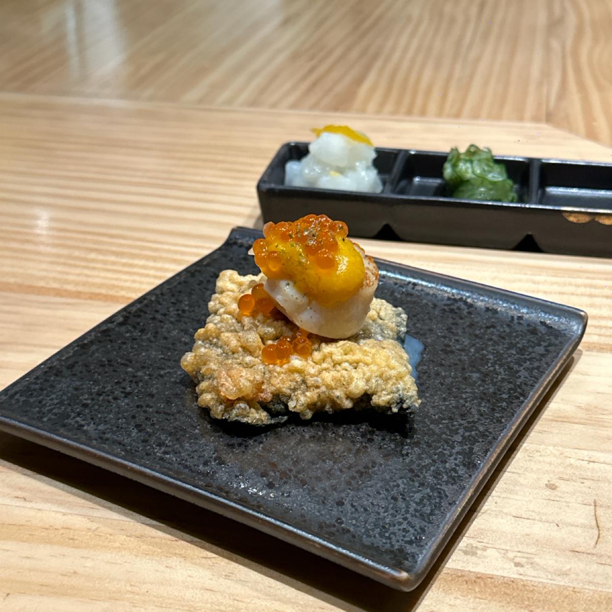 Scallops with Sea Urchin and Fish Roe: Pan-seared scallops topped with sea urchin and fish roe deliver a melt-in-your-mouth sweetness, with squid rice crackers at the bottom adding an unexpected crunch.
