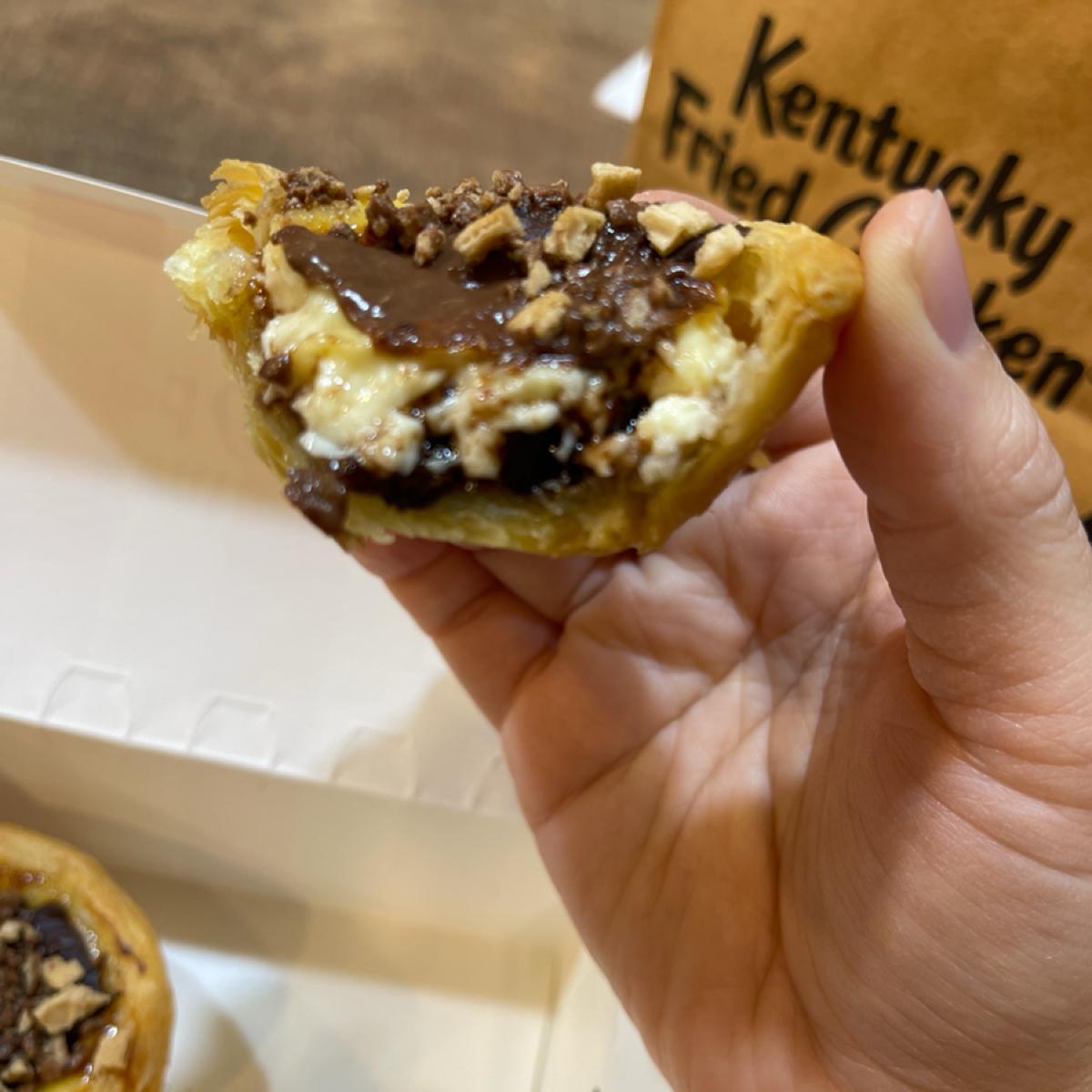 Chocolate lovers may enjoy this tart. If you like gooey fillings, it's best to eat it while hot, as it will solidify in the winter. Eating it fresh, you get the sweet and creamy texture of the tart, but it might be a bit too rich. The chocolate overpowers the aroma of the original tart, and by the end, I still prefer the original flavor. The other tart, stored in the fridge at home, has a different taste.