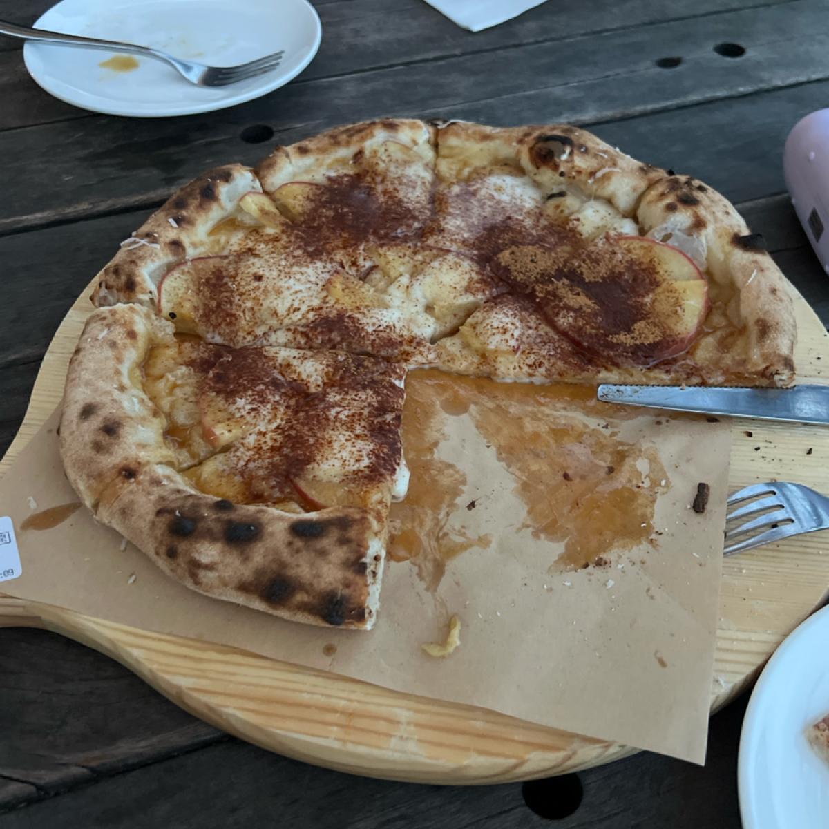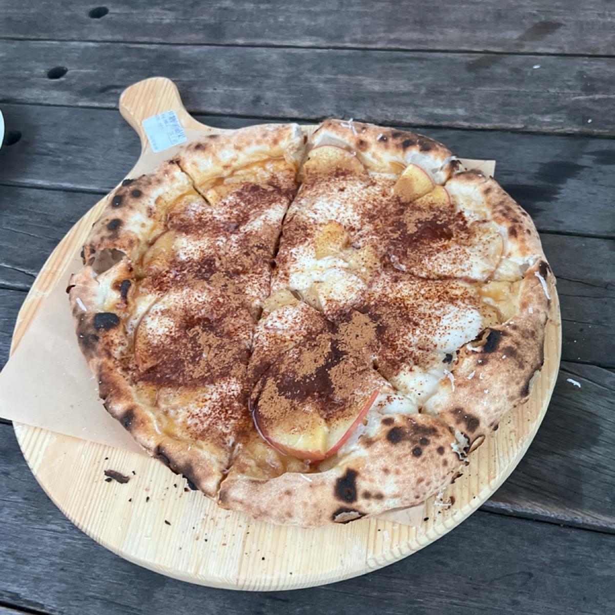 -甘いピザで、シナモンの味が強いですが、辛さは感じません。キャラメルとリンゴのスライスと一緒に食べるととても特別ですが、長く食べていると少し重たい感じと甘すぎるかもしれませんので、大勢でシェアするのが適しています。