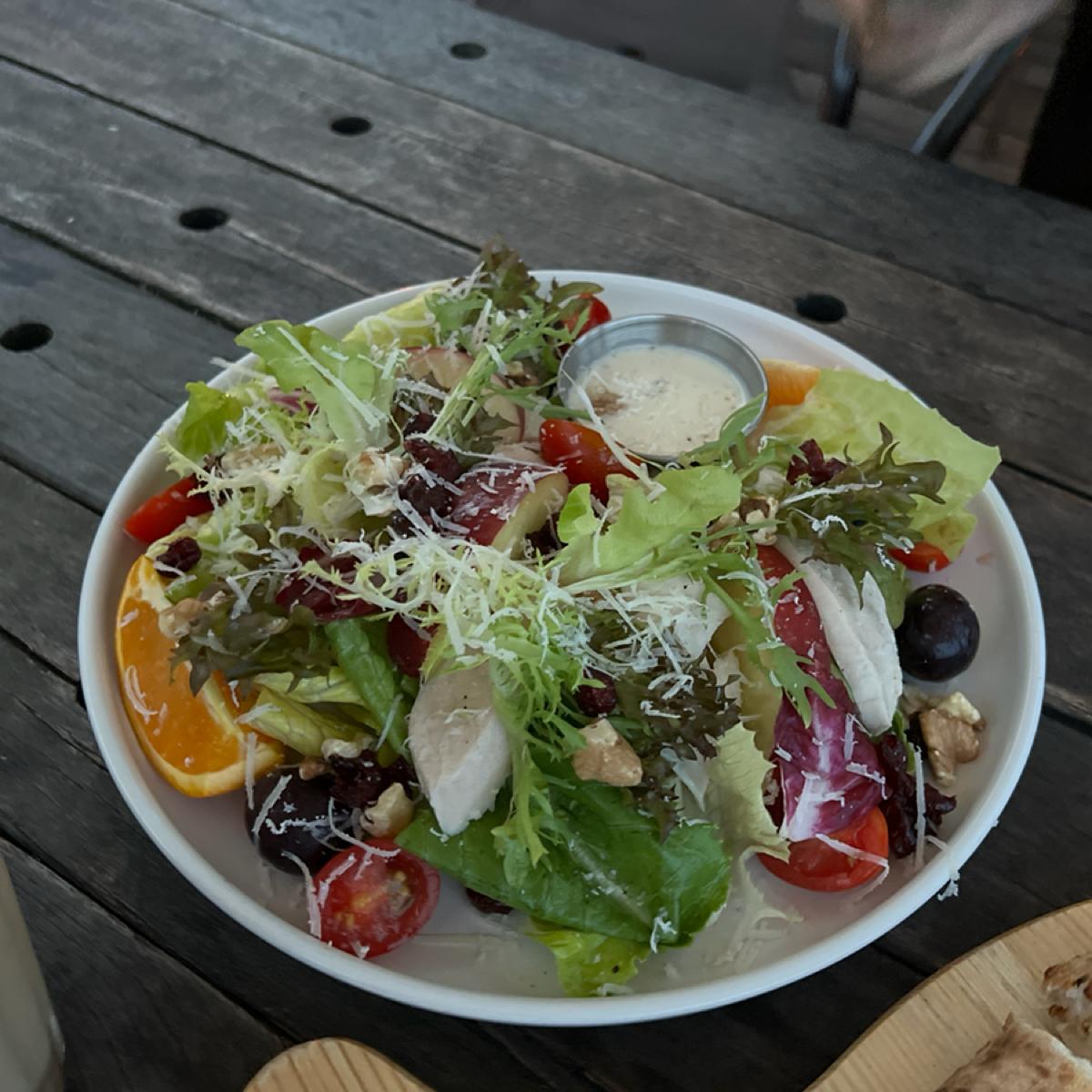 -サラダの具材がとても豊富で、ブドウ、ナッツ、レーズン、トマト、フルーツが入っています。シュヴァイチキンの厚さはちょうど良く、外で薄く切られているものとは違います。ドレッシングはちょっとシーザードレッシングのような感じですが、他の何かも加わっているようで、食べるととても特別な味わいです。