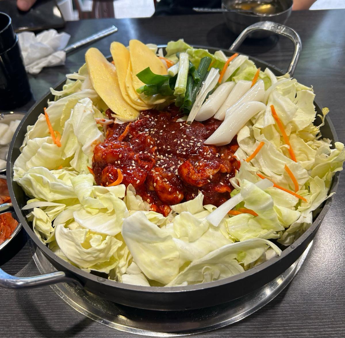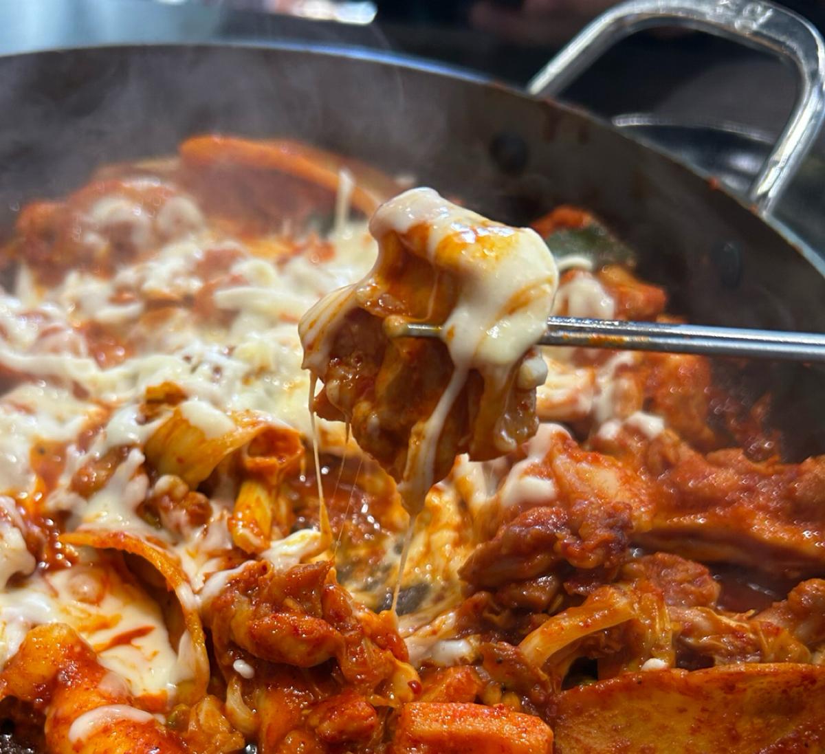春川式辛炒鶏の2人前には、野菜、チーズ、おにぎり、スープが含まれています。