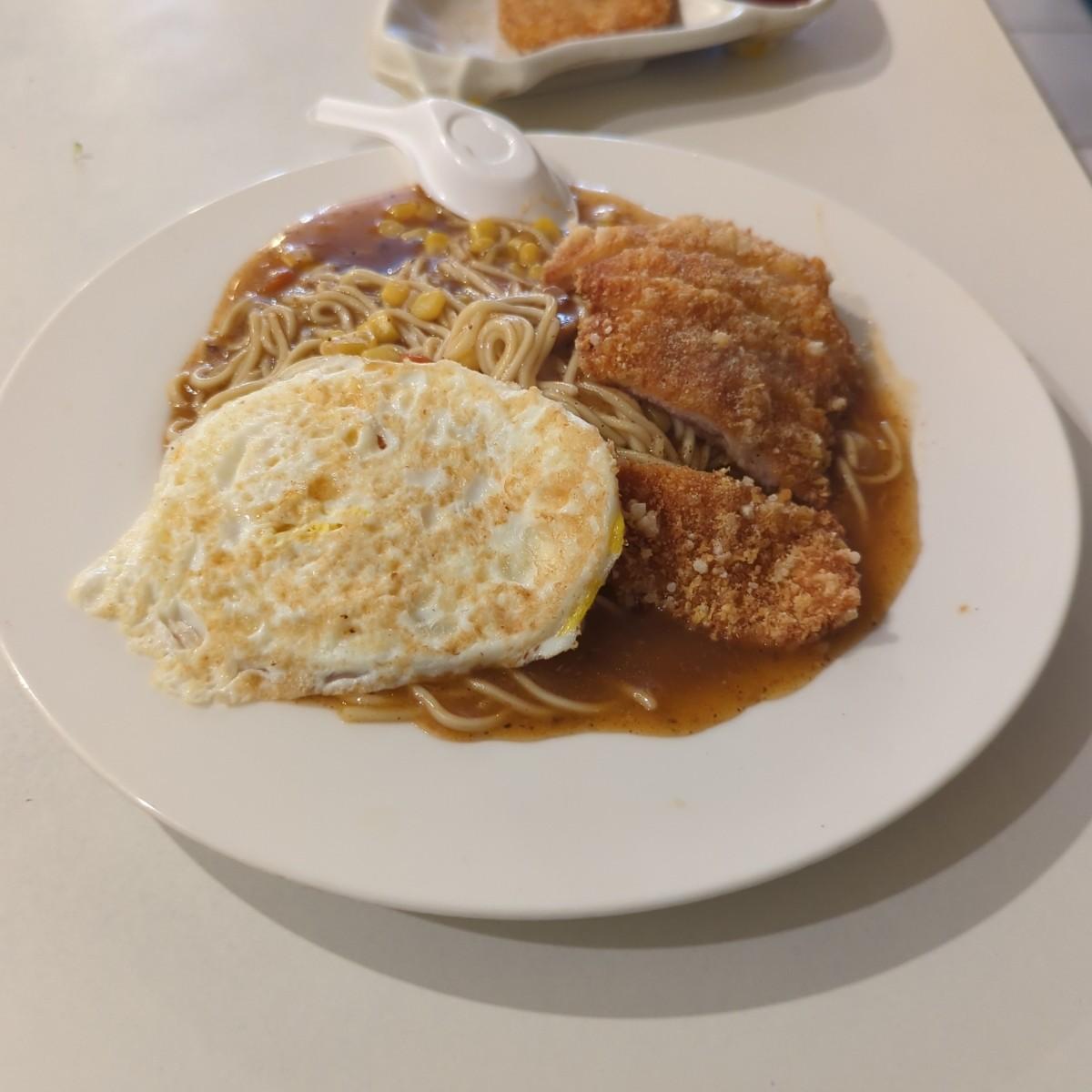 鉄板焼き麺、卵、チキンステーキ、オレンジジュースが含まれます
