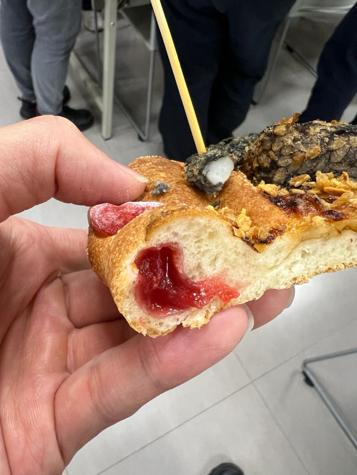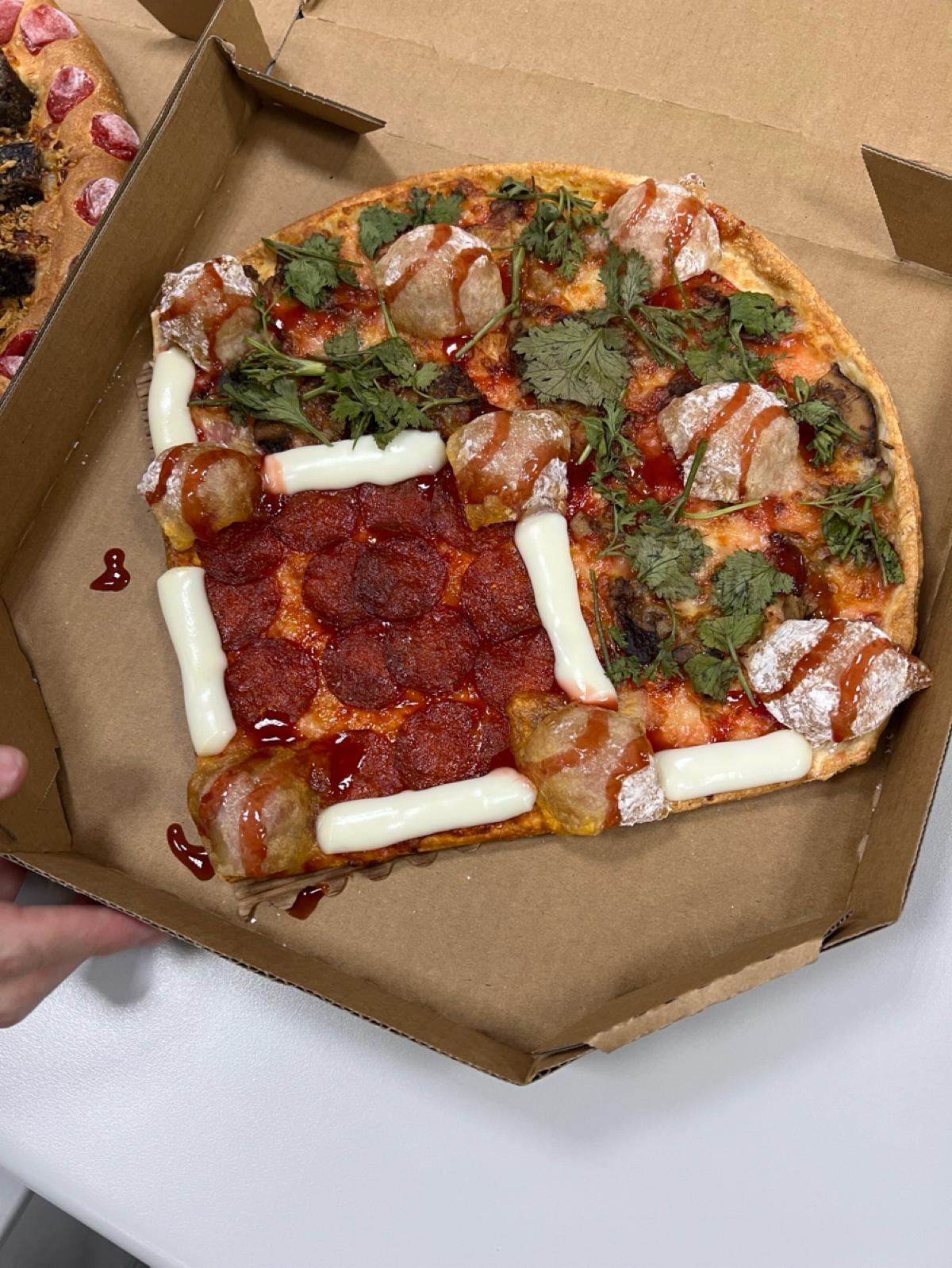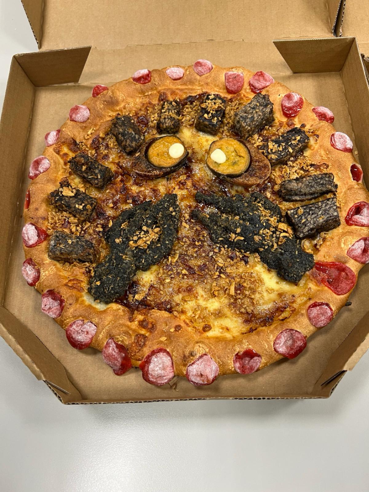 まず今年のハロウィンピザについて。トッピングには米血、ピータン、黒いイカの足が含まれており、視覚的には非常にインパクトがありますが、全体の味わいはあまり良くありません。生地の部分では新しい試みがあり、チーズクラストを「辛いトマト餅」に変えています。トマトソースとチリソースを餅に融合させた感じです。この組み合わせは面白いと思いましたが、同僚たちはこの味に馴染めなかったようです。
