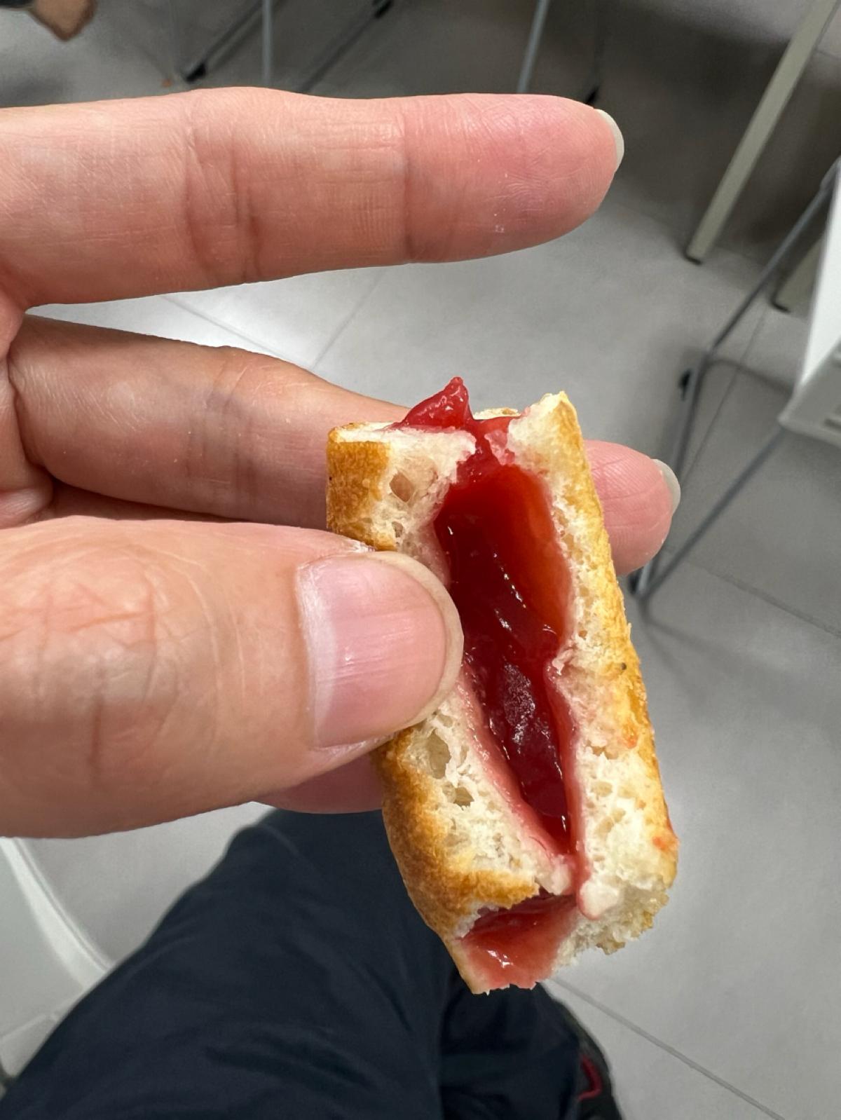 次に野球場ピザですが、このピザのコンセプトは異なるエリアに異なるトッピングを配置するというものです。「三塁内区」にはハムがたくさん詰められていますが、塩辛すぎて食べられません。一方、外野区の味付けは薄すぎで、まるで塩を全く使っていないような感じです。一番の問題はホームベース部分で、小さなお団子が使われていますが、中の肉は生臭く、新鮮さに欠けるように感じました。