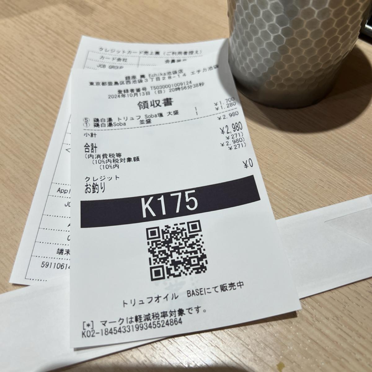 今回は特製の鶏白湯鮮トリュフラーメン大盛(1780円)と鶏白湯そば(1280円)を注文し、合計2980円でした。