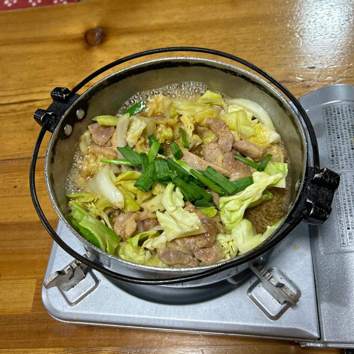 カセットコンロの連続加熱で鶏肉とキャベツをしっかり混ぜて調理します。