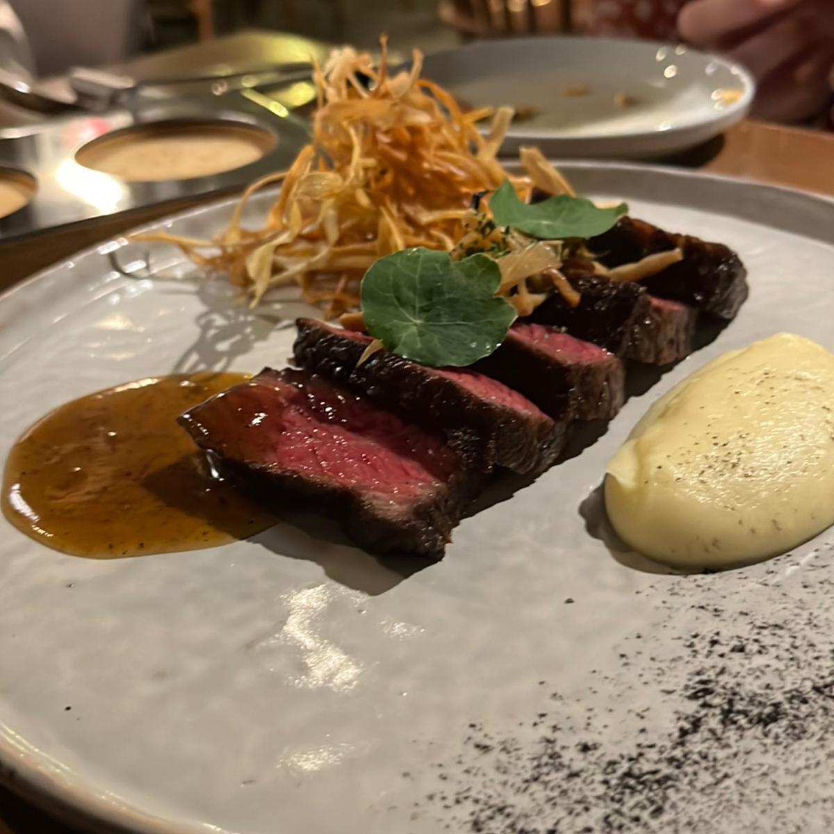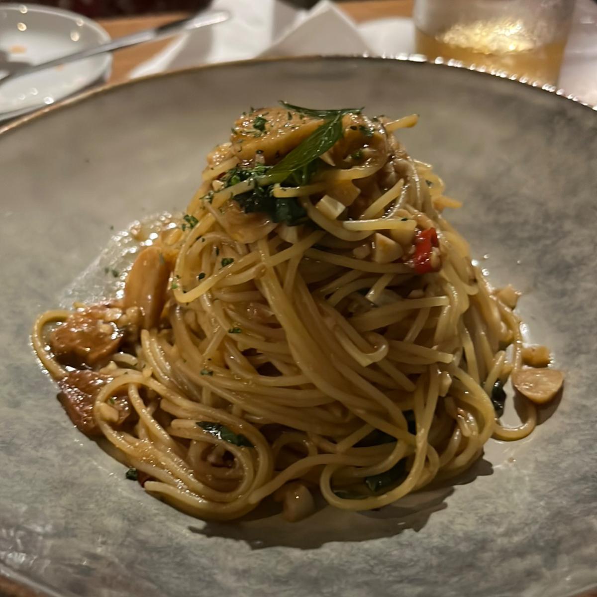 メインディッシュ:オリーブオイルとニンニクと唐辛子が効いた細麺がビールによく合います。それから、もちろん、赤ワインと組み合わせたプライムビーフショートリブもあり、マッシュポテトも添えられます。