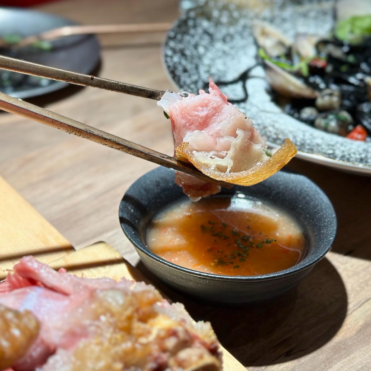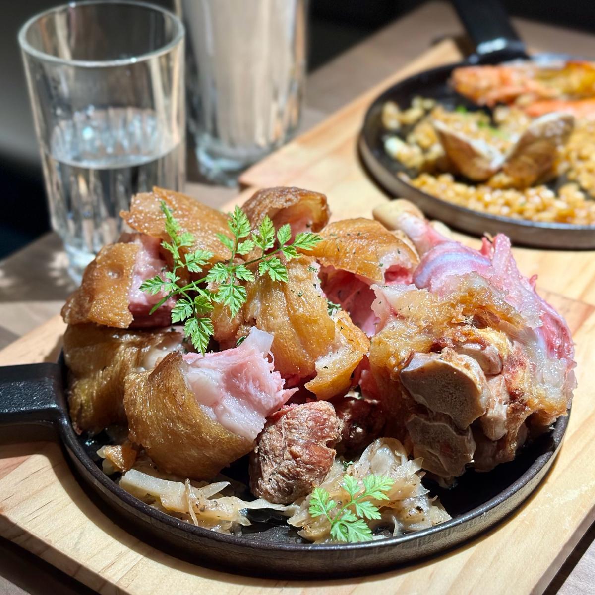 ✅ 特製ドイツ風豚足:豚足、自家製ザワークラウト、赤ワインガーリックヴィネガーが含まれています。ドイツ風豚足の外側は金色にカリカリに焼かれ、柔らかさを保ちながらも肉も厚みがあり、赤ワインガーリックヴィネガーと共に食べると酸味と辛味が食欲をそそります。下に敷かれたザワークラウトは玉ねぎとじゃがいもを使って作られており、豚足と一緒に賞味することで味覚のバランスが取れます。