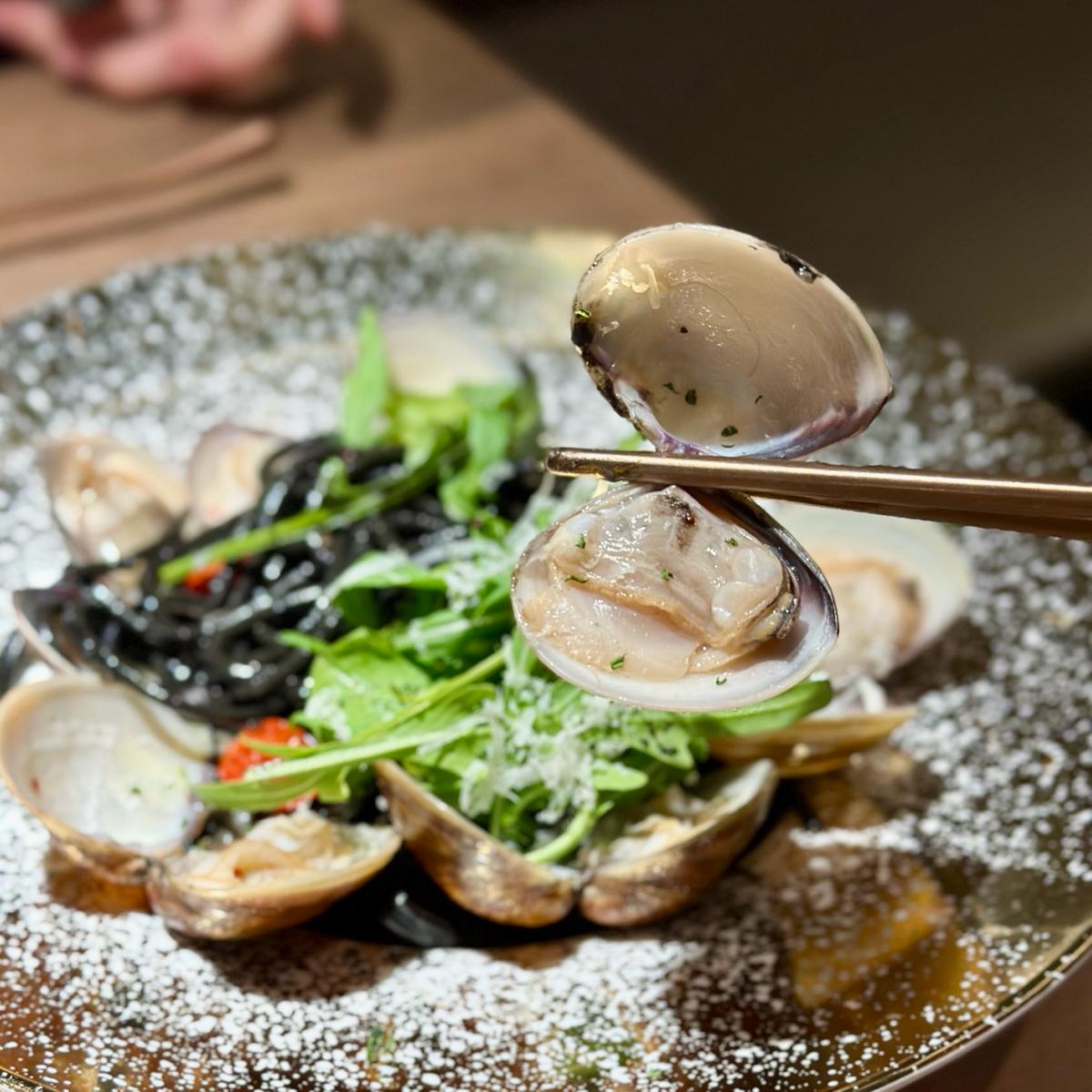 ✅ 貝とイカスミのパスタ:イカスミパスタ、北海道干貝、貝、ルッコラ、ドライトマトを使っています。麺は口に入れると貝の甘みが広がり、塩味もしっかりと調和が取れています。ルッコラと一緒に食べることで一層複雑さが増し、風味が調和しています。貝もどれも新鮮で美味しいです。