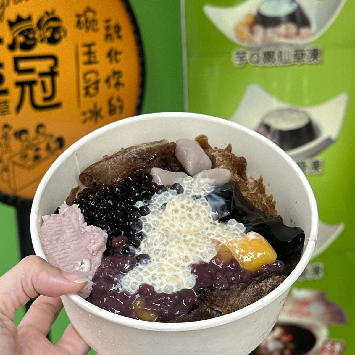 かき氷の具材はタロイモボール、小豆、サツマイモボール、サゴ、タロイモピューレ、草ゼリーがたっぷり入っており、下のかき氷もふわふわの妖精シルクでできています。爽やかな味わいで、氷も含めて草ゼリーの量は少ないですが、口いっぱいに草ゼリーの味わいが広がります。クールダウンは必須です。
