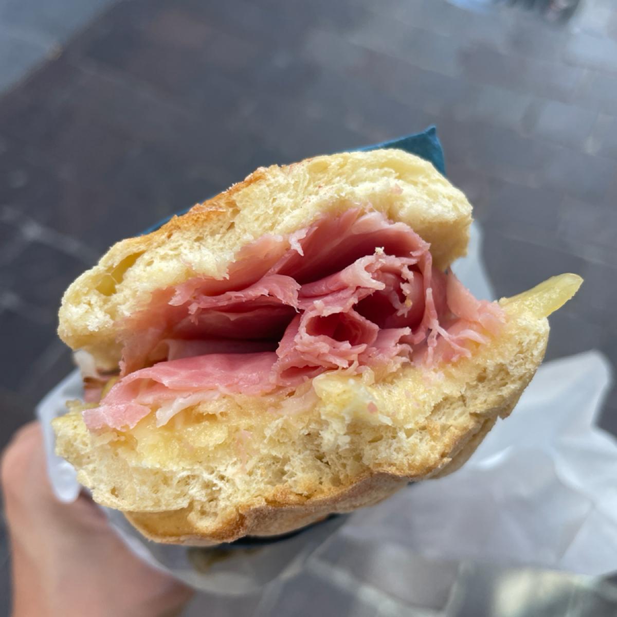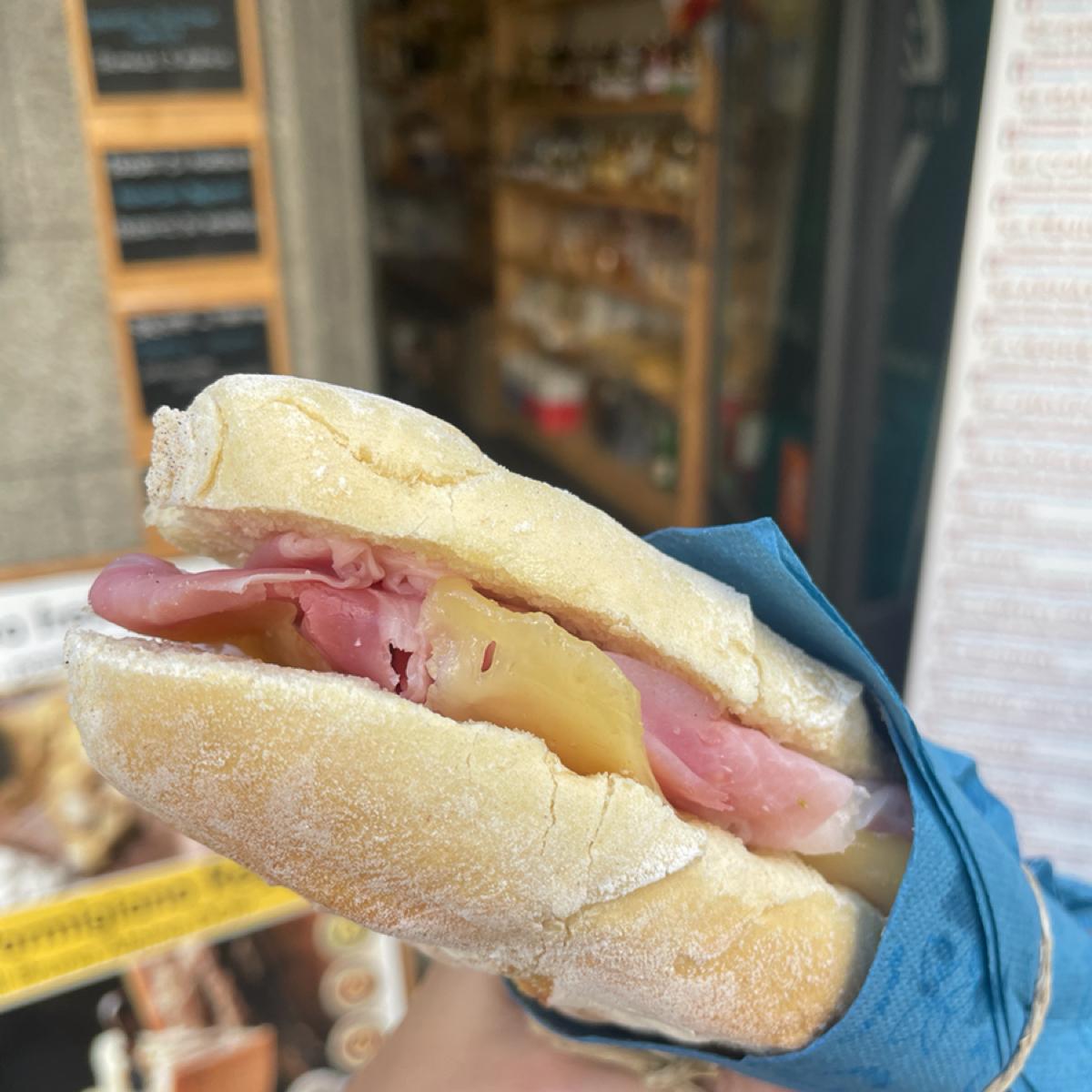 実は「Nicoletta srl - Prodotti caseari」はチーズ専門店で、店内にはあらゆる種類のチーズがあり、いつもチーズと一緒に食べている生ハムももちろんあるのですが、YouTuberがサンドイッチを紹介しているため。 , 今回はサンドイッチだけを買います