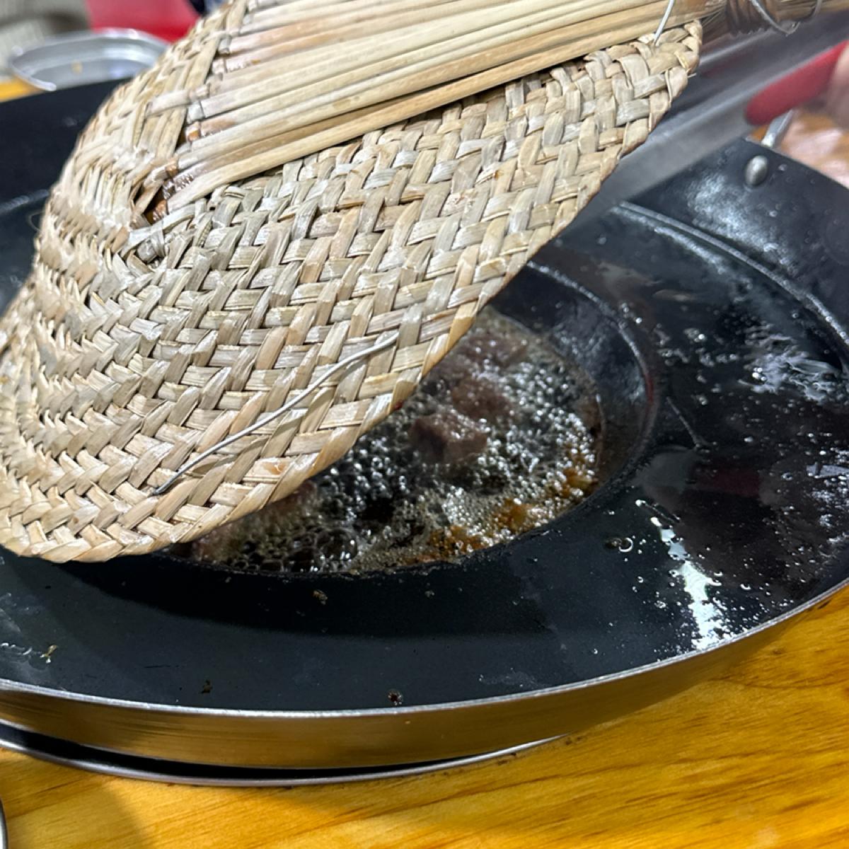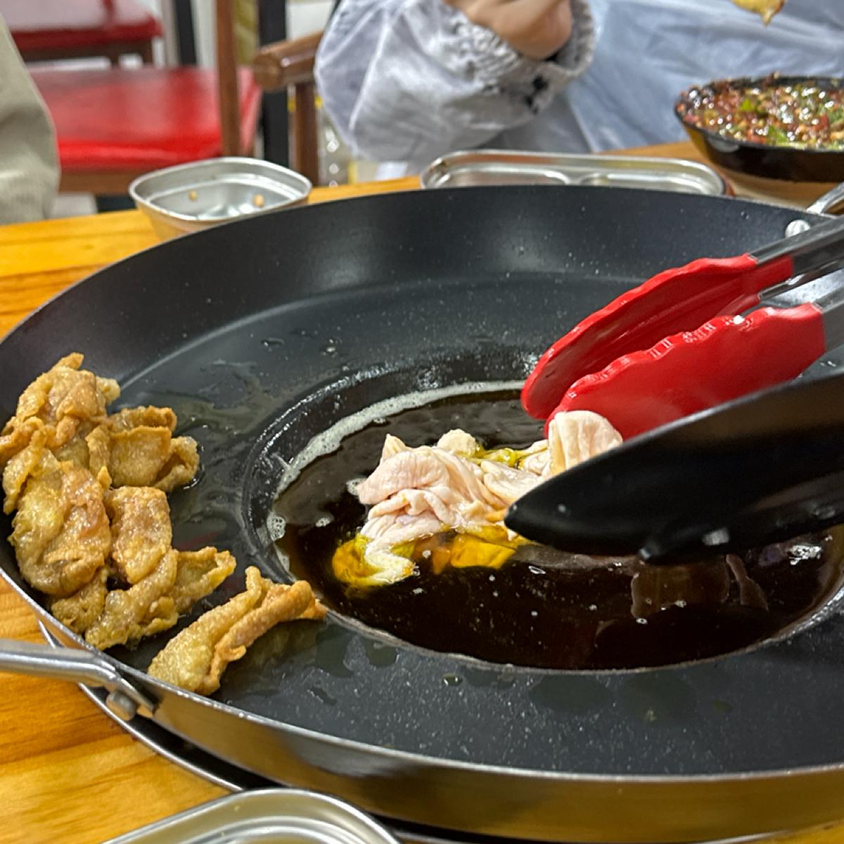 鍋の真ん中に菜種油を注ぎ、具材をその場で炒めます!ぱふ、ぱふ、とても香ばしくて、とても美味しいです