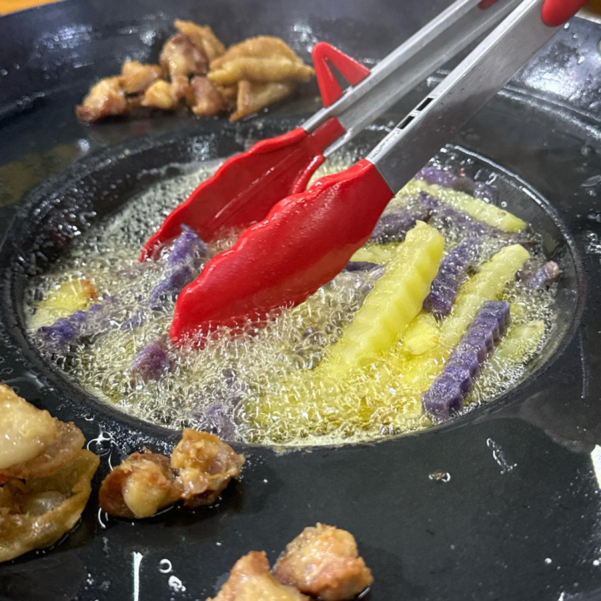 紫と黄色のジャガイモを混ぜて揚げたもの
