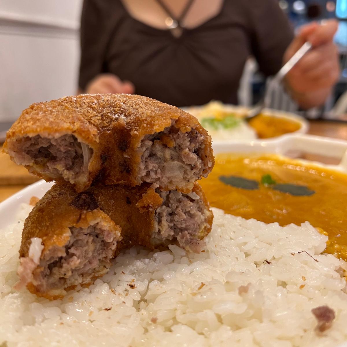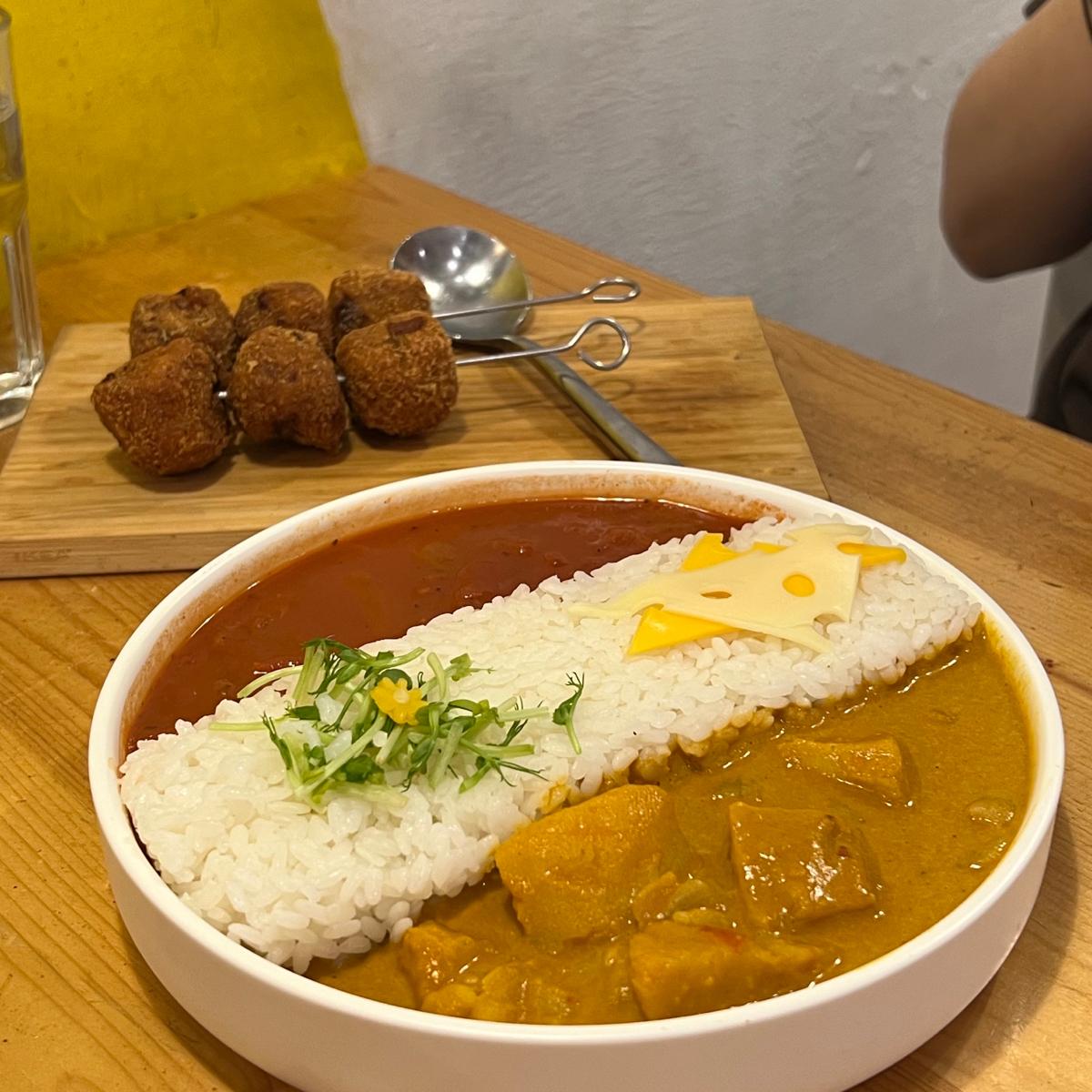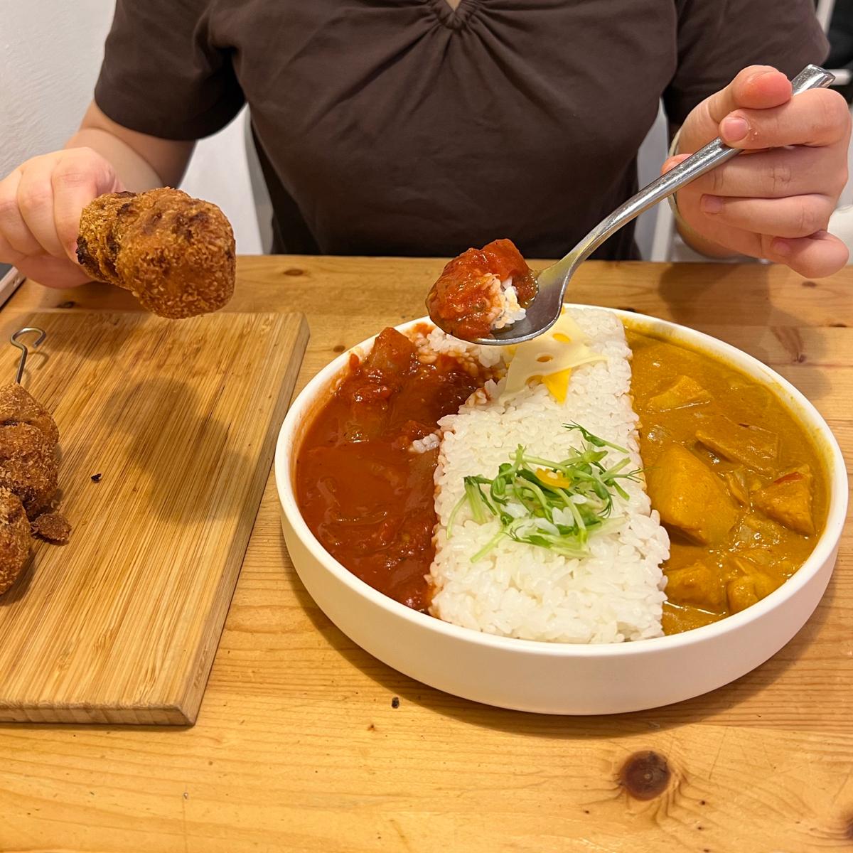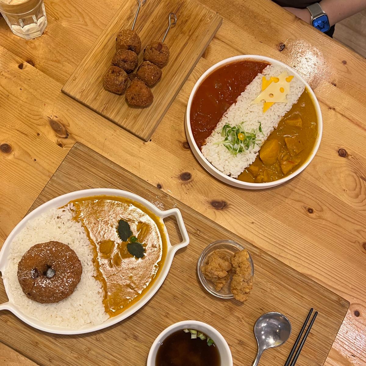 ミートボールはビーフドーナツによく似た味です。つくねは2本でかなりボリュームがあり、かなりお腹が満たされます。 タレも2種類あるので味を変えられます。トマトソースはあっさりしていて、ほんのりトマトの酸味が感じられます。カレーは前回と同じ南洋風カレーです。料理を提供するときに、ウェイターは一緒に食べないように特に言いました〜