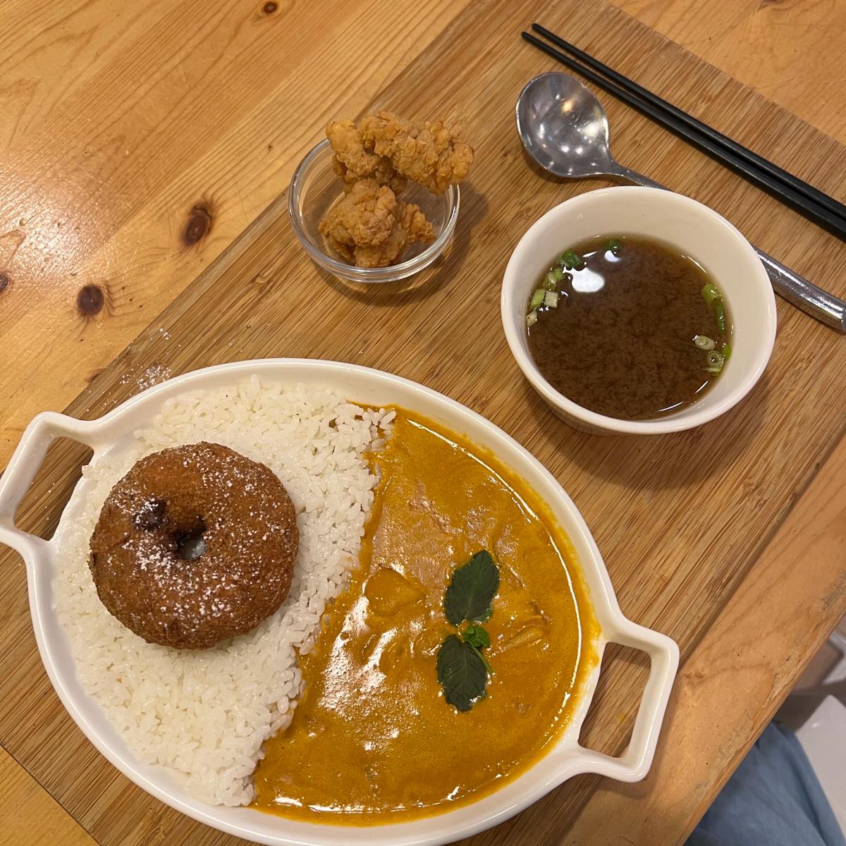 チーズビーフドーナツは非常に特徴的で、かなりジューシーで味付けは十分ですが、食べた後は少し脂っこく感じます。カレーはジャガイモの塊がたっぷり入った南洋風で、味は薄味で特に特徴はありません。量も多いので、満腹にならない心配もありません。