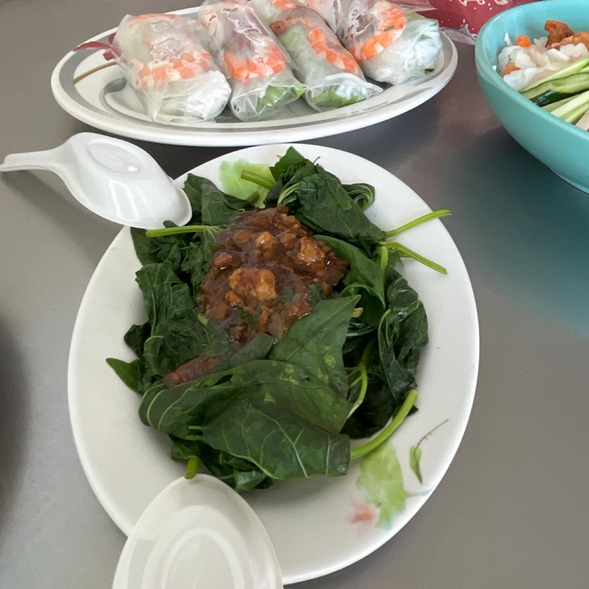いつからか、私はベトナムの豚カルビ飯が大好きなんですが、台湾のお店ごとに味も調理法も違います。こちらは豚バラ肉をマリネしたもので、見た目は赤く味も甘く、私の好みのタイプではありません。同僚も付け合わせとして温野菜と白エビを注文しました。このセクションの料理は台湾の炒め料理に似ています。ただ、白エビは値段が少し高いので、個人的にはここで食べるのはやめたほうがいいと思います。ご希望の場合は生春巻きもご注文いただけます。味も美味しいし、具材も新鮮だし、量もたっぷりなので、生春巻きだけ食べてもお腹が空く心配はありません。