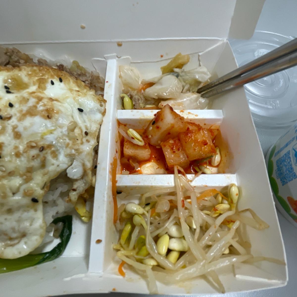 お弁当を開けて中身を見て少し唖然としましたが、ご飯は満腹ではなく、青菜が3、4切れしか載っていませんでした。 おかずは3品(台湾キムチ、韓国キムチ、もやし)でした。 )サイドにあるものはすべて2口程度で食べられました。全体的に量が非常に少ないので、非常に不誠実に感じます。