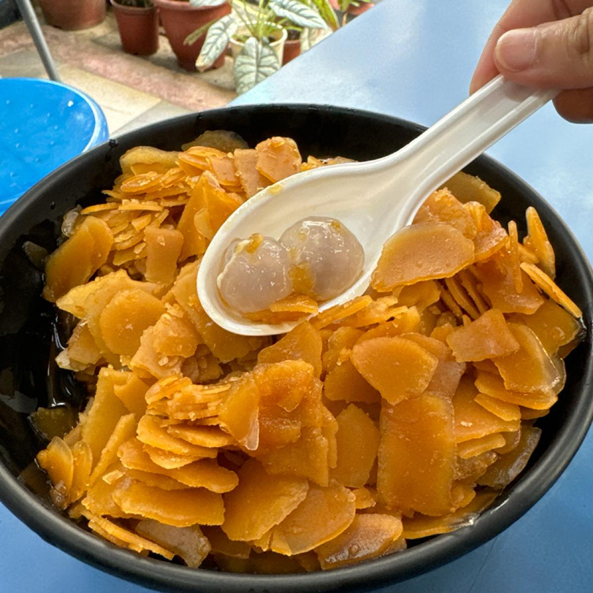 黒糖味のフレーク状の氷も形が不ぞろいで甘すぎず、おむすびはとても柔らかくて、お店で作ったプリンとあいゆのような食感です。甘すぎるのも。