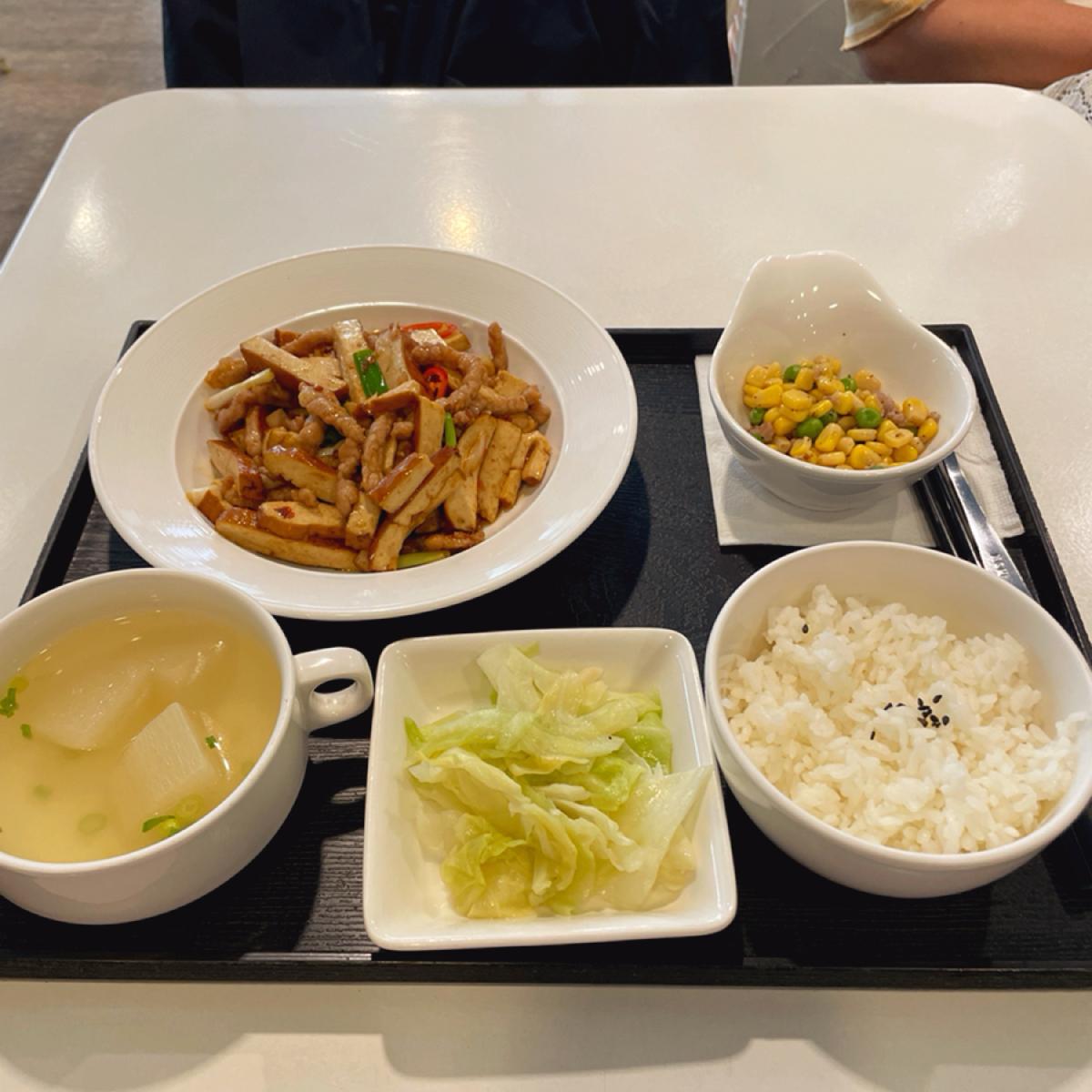 豆干炒肉絲定食を注文しました。メインの他にご飯とスープとサイドのおかず、デザートがつきます。
