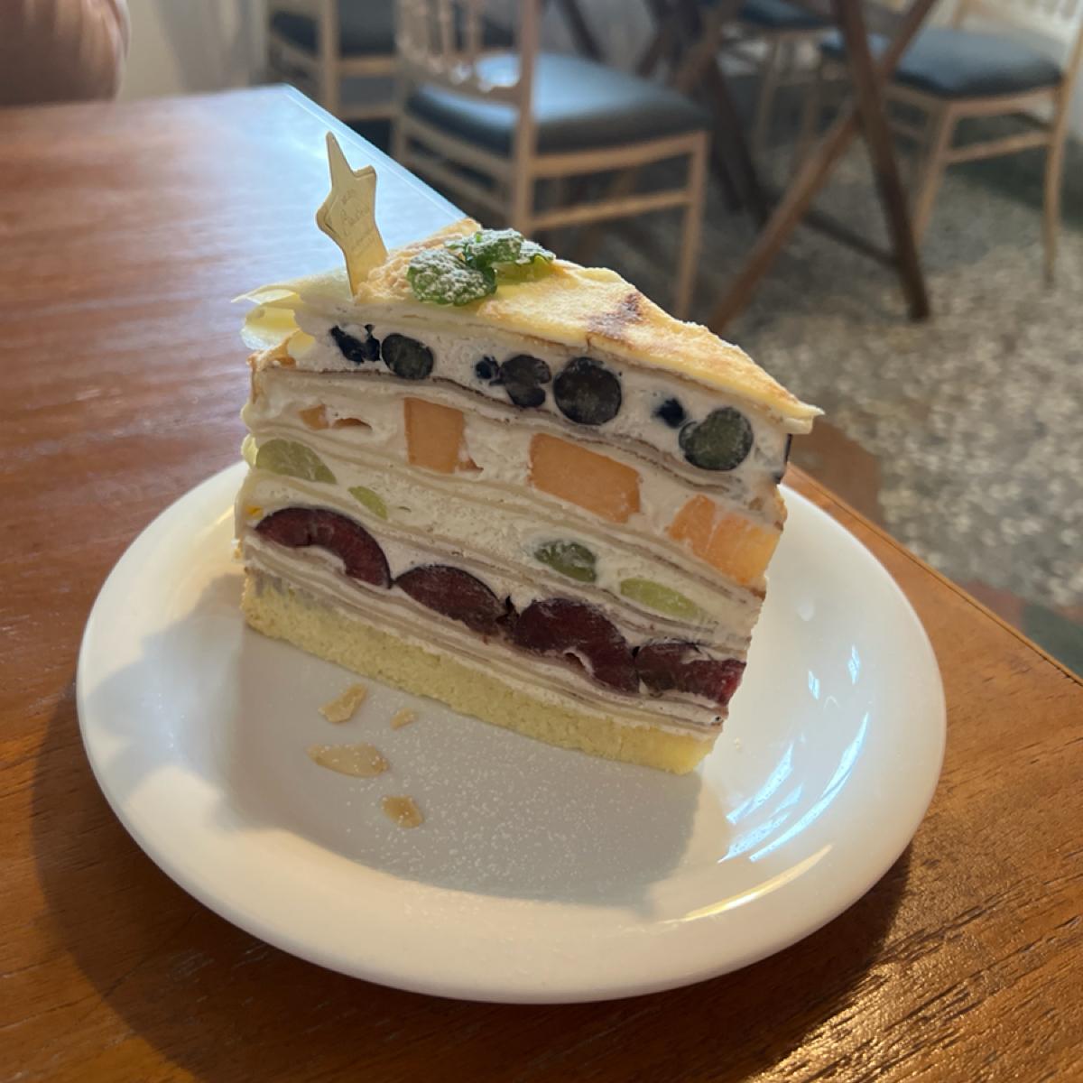 水果千层($230):层层叠叠的饼皮间夹着鲜奶油和水果,甜度适中,酸甜的水果提升了整体的清爽感。