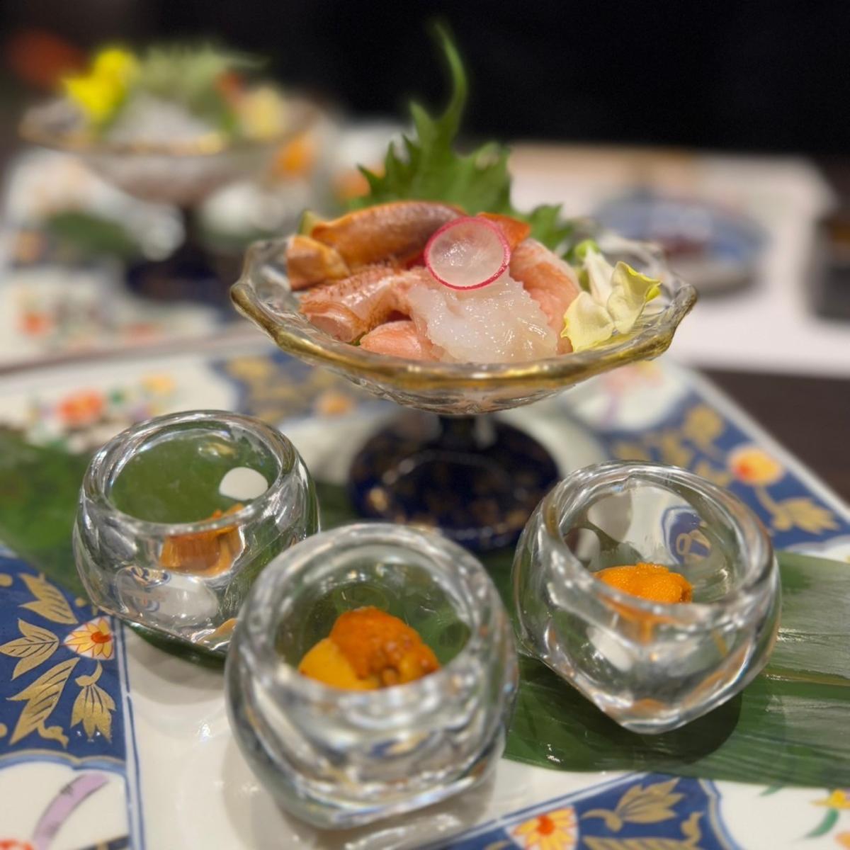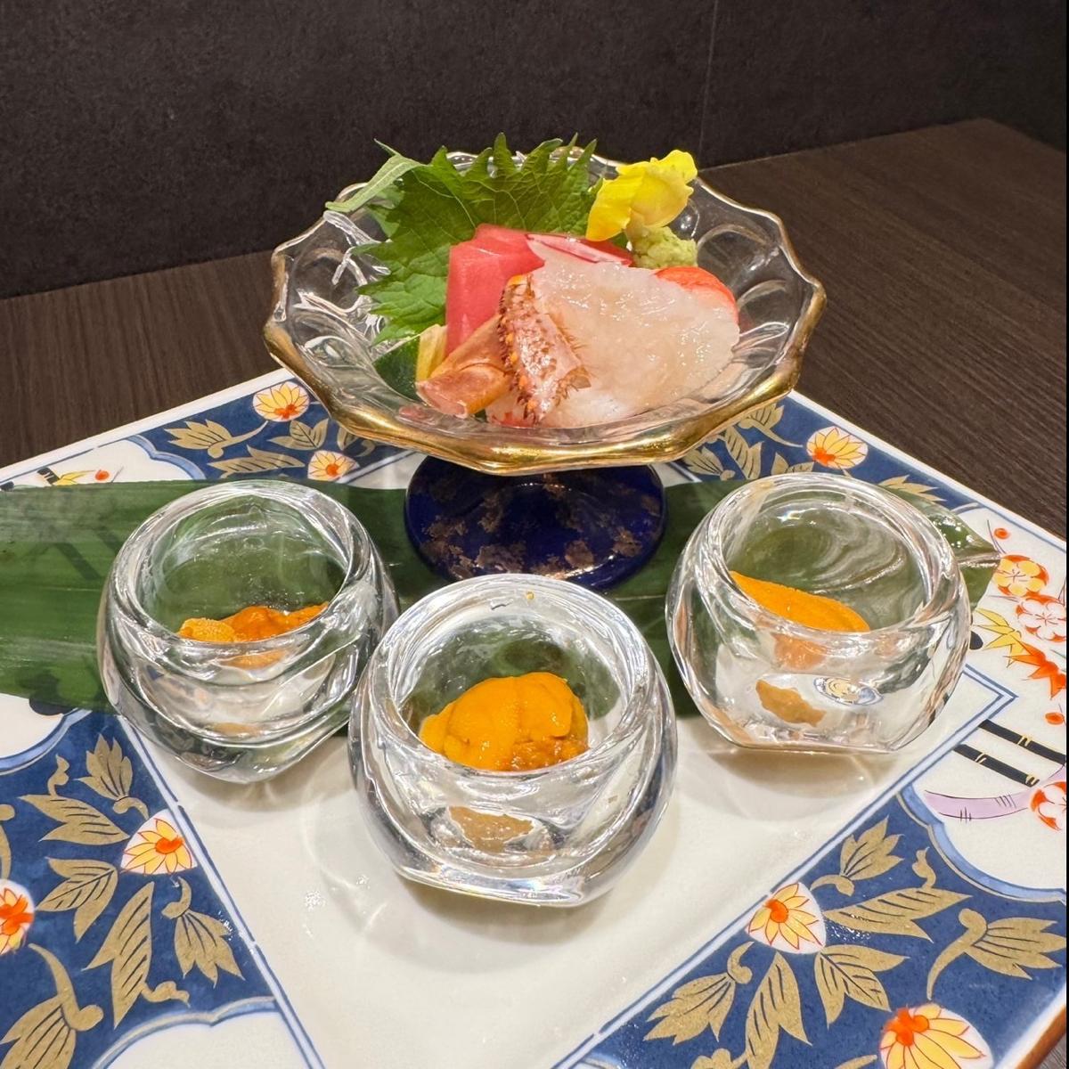 毛蟹のお造り、雲丹3種食べ比べ