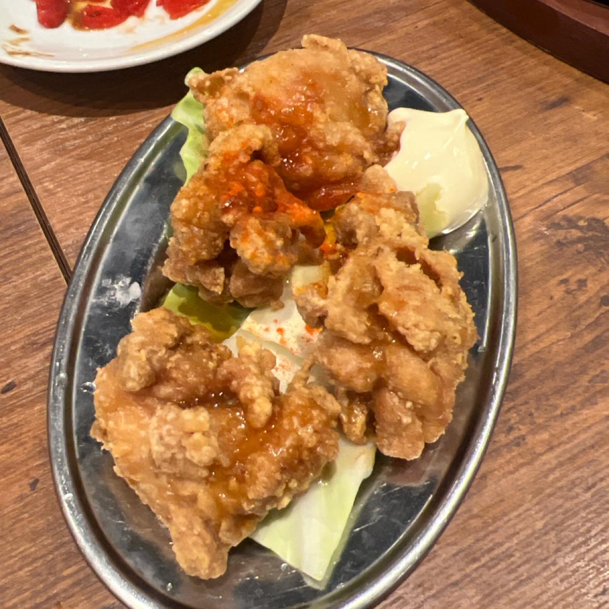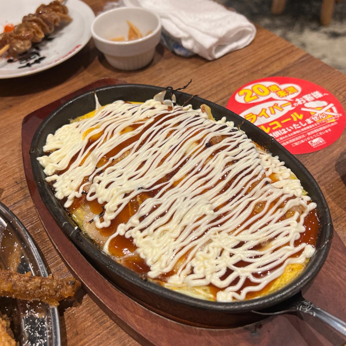 🍢鶏皮串はとてもカリカリに焼かれていて、タレは少し甘めです。鶏の唐揚げは皮がパリッとしていて、肉はかなり柔らかく、マヨネーズと一緒に食べるといい感じです。お好み焼きは鉄板で作られ、濃厚な味わいです。