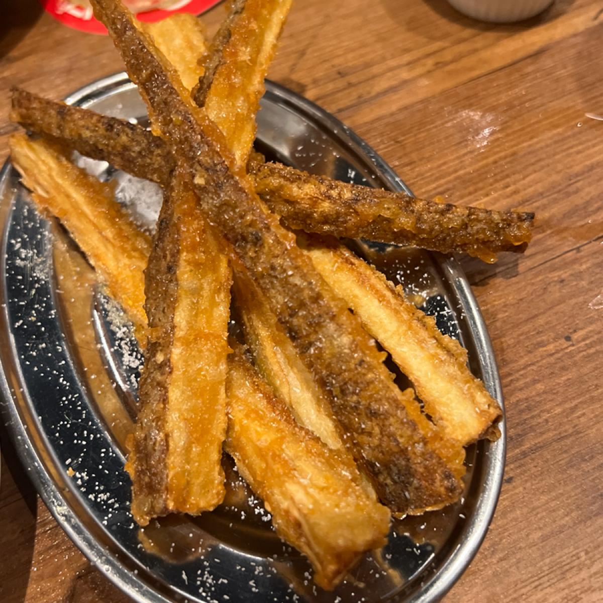 🍟揚げゴボウのスティックは塩味のチュロスのようで、カリカリした食感がビールとよく合います。