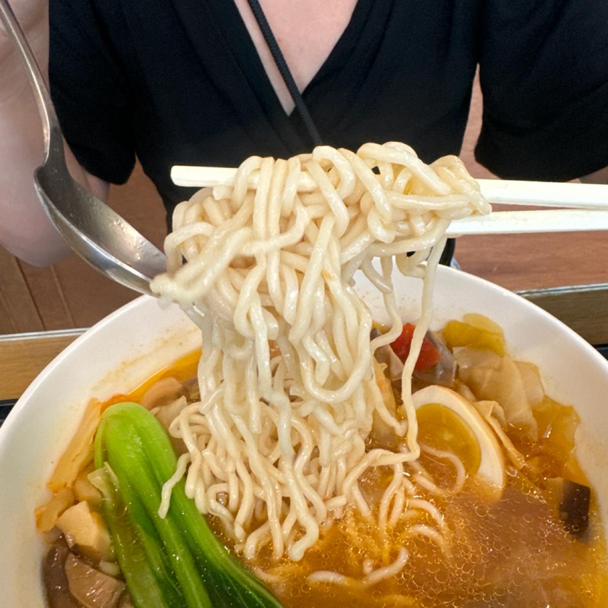 トマト野菜スープ麺のスープは、大量のトマトで煮込まれており、とても甘くて飲みやすいです。中にはたっぷりの野菜ときのこが入っていて、噛み応えのある手作り麺と非常に相性が良く、長く浸しても柔らかくなりません。