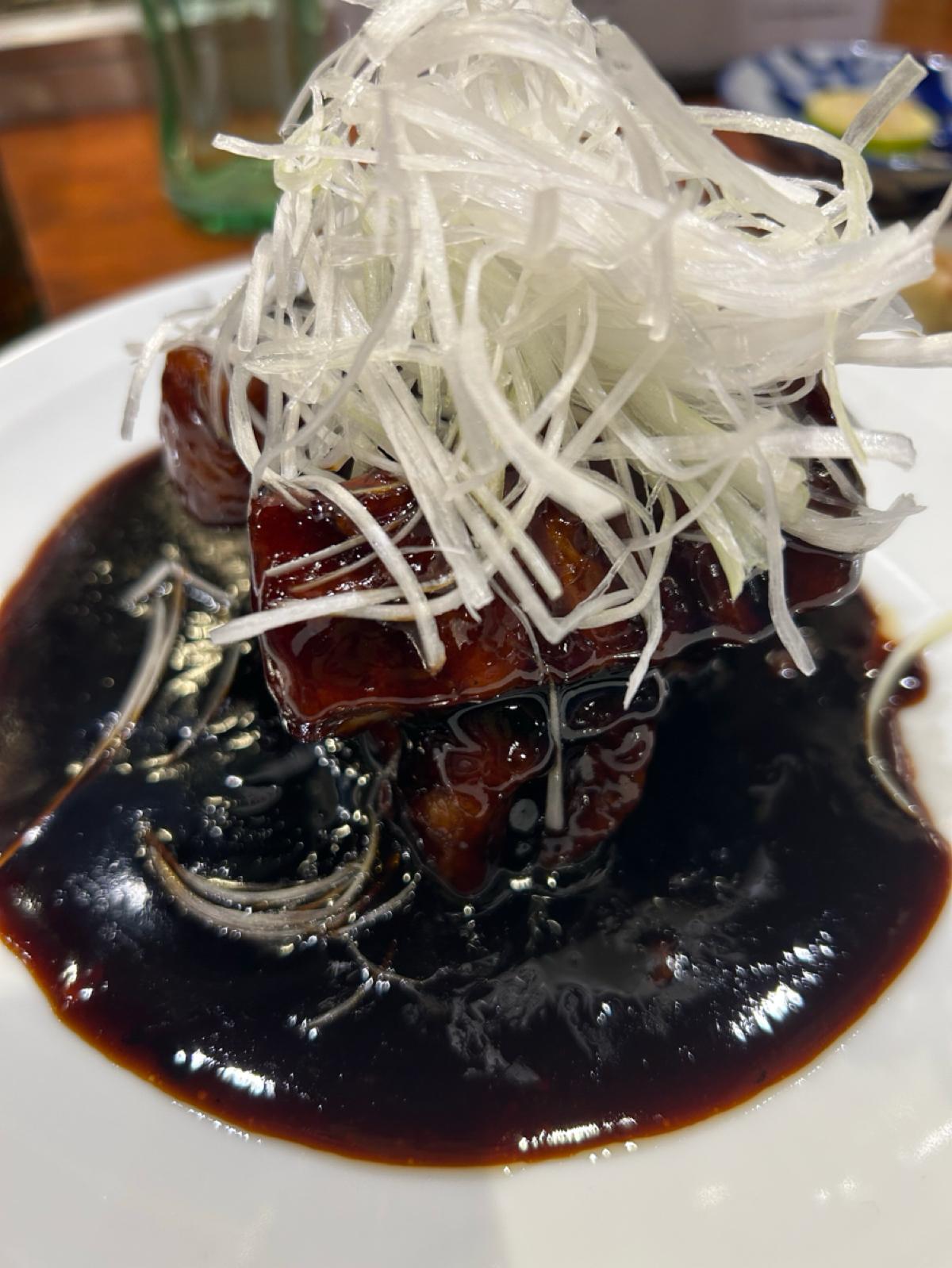 ◉黒酢豚 - Black Sweet And Sour Pork 。¥1408。見た目・味:ブロックのように大きい豚バラの塊に甘〜い酢ダレで美味しい。