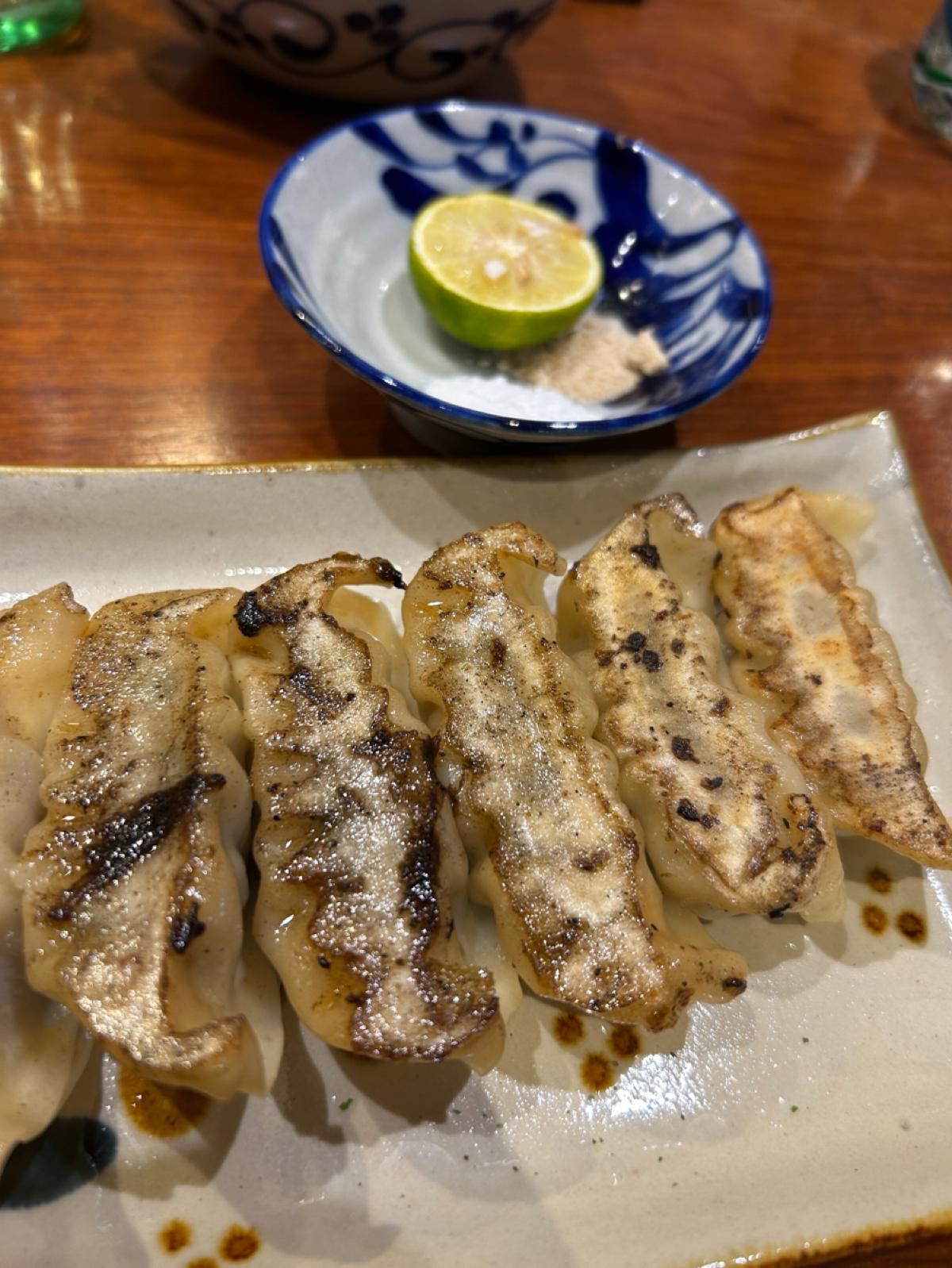 ●アグー豚の焼き餃子 - Agu Pork Grilled GYOZA ¥880。6個入りで最初は何もつけずそのまま、次に雪塩で最後にすだちときび糖に付けて食べる。アグー豚の旨みが美味しい。