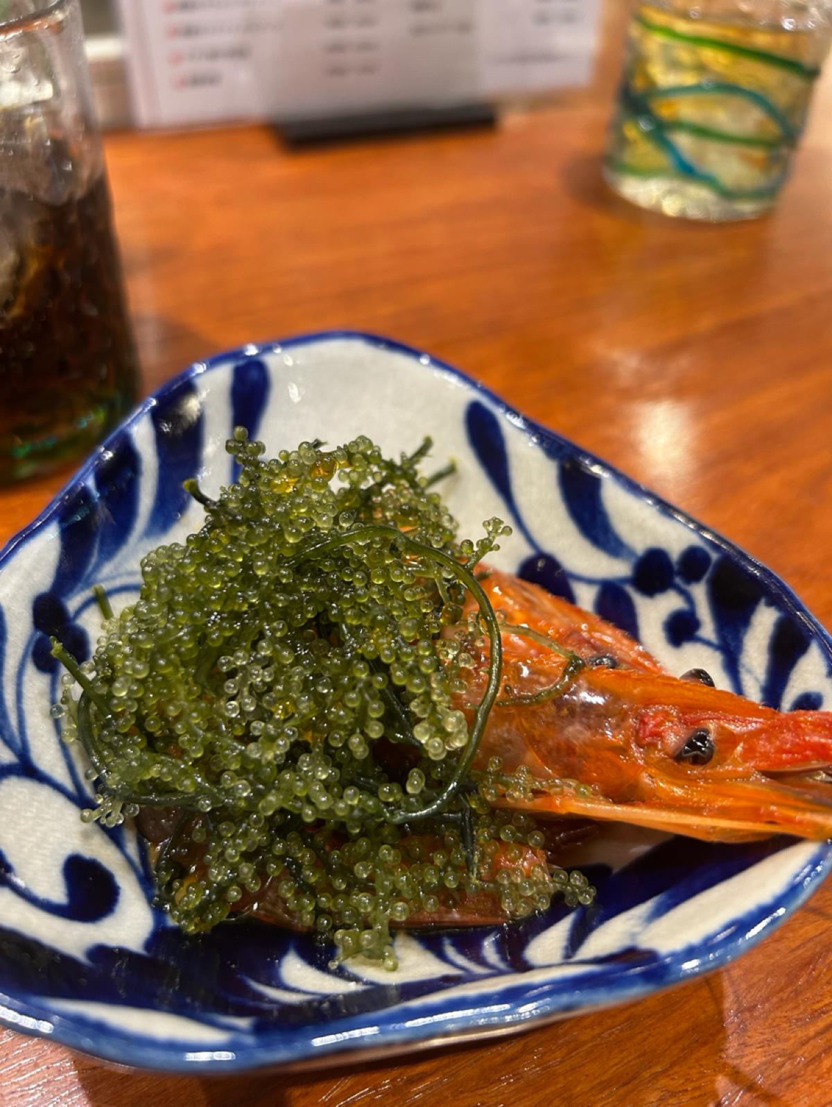 ●生海老の中華醤油漬け - Shrimp Marinated In Chinese Soy Sauce 。¥620。醤油がしっかり味付けされていて海ブドウのプチプチ感が合う。