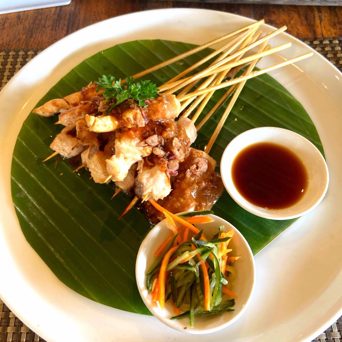 焼き鶏肉と魚肉のミックスサテで、合計十串あります。上にピーナッツのサテソースがかかっています。サテは悪くなく、ソースが特に良かったですが、量が少し少なめで、一串につき大体三つの小さな肉しかありません。一人前にはなりませんが、暑い時期であまりお腹が空いていなかったので、二人の女性が一緒に汚れたアヒルご飯を分け合うことができました。