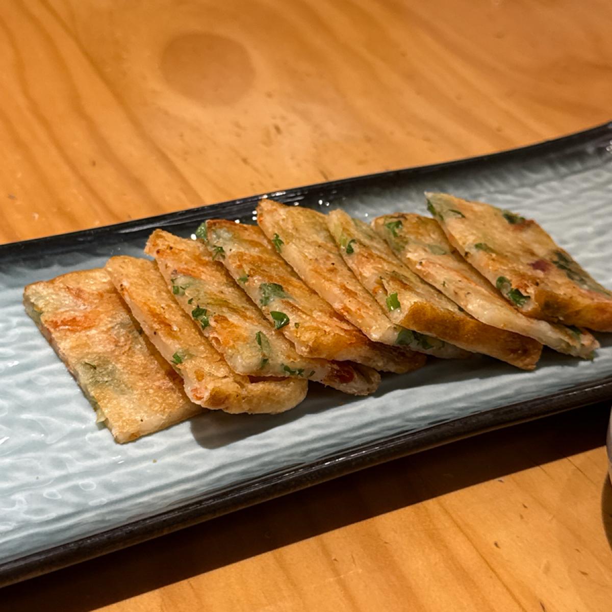 外皮が香ばしくパリッと焼かれていて、つけダレとの相性も良いですが、海鮮の具材が少し物足りなく、主に生地の食感を楽しむ感じでした。