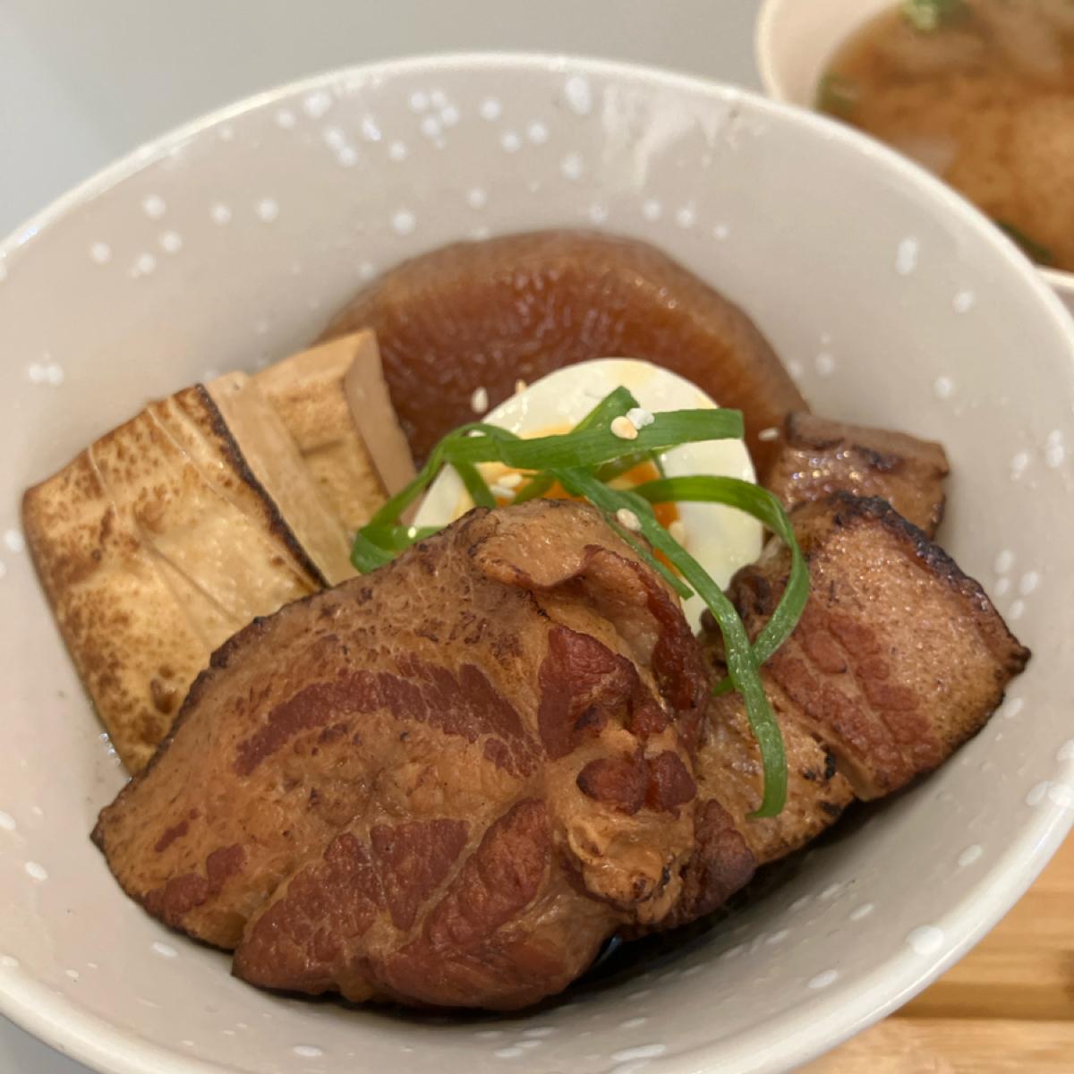 ・豚バラ肉を使用し、豆腐や大根と合わせてご飯が進む一品です。あっさり派には少し塩辛いですが、肉をつまむとホロホロと弾け、豆腐のマリネの焦げた香りもとても美味しいですが、食べ盛りの人には量が少ないかもしれません。