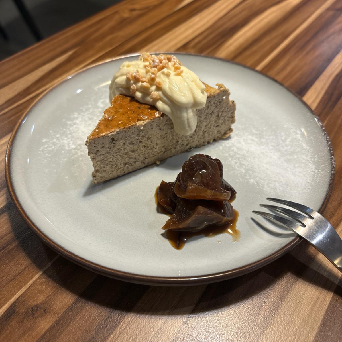 > チャイ香のアールグレイチーズケーキ(単品価格180元)は、ふわふわのケーキ生地で、押すと「ふわっ」となり、横には黒糖漬けのリンゴが添えられています。店のおすすめと書かれていましたが、他のものを頼んでも良いと思いました。