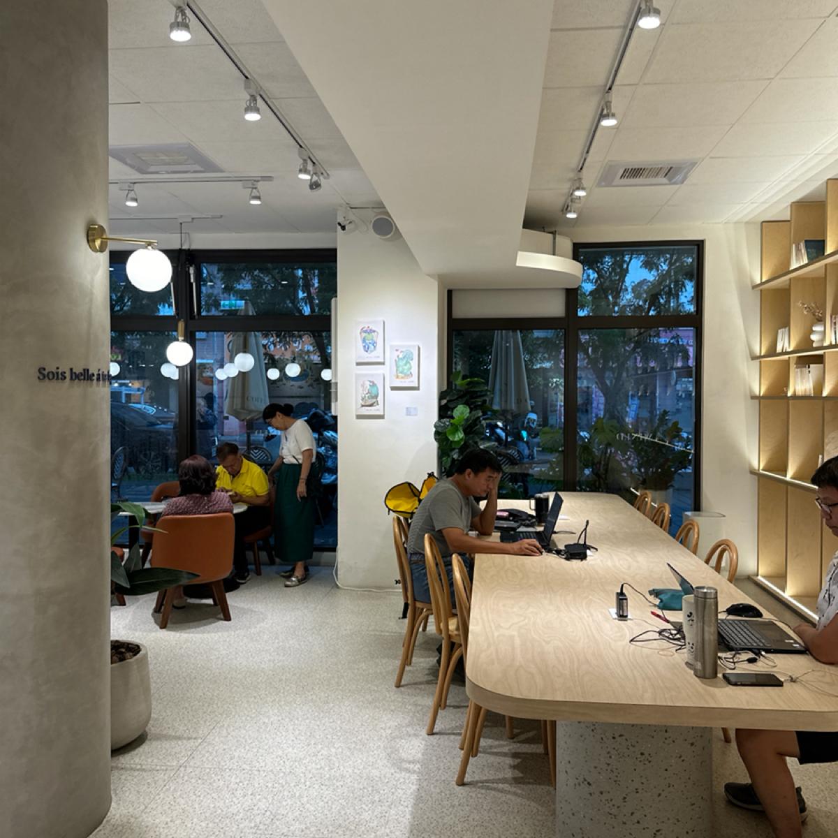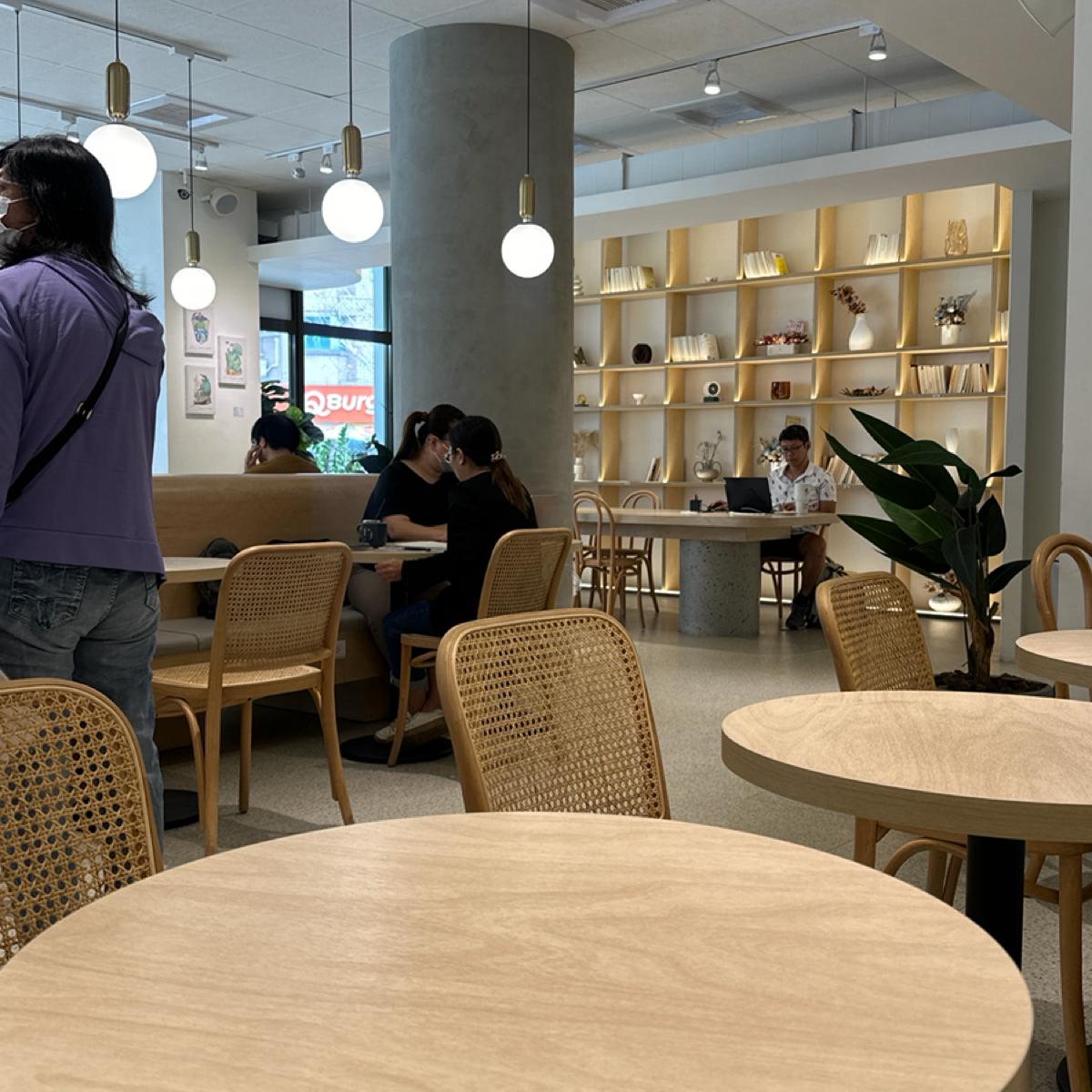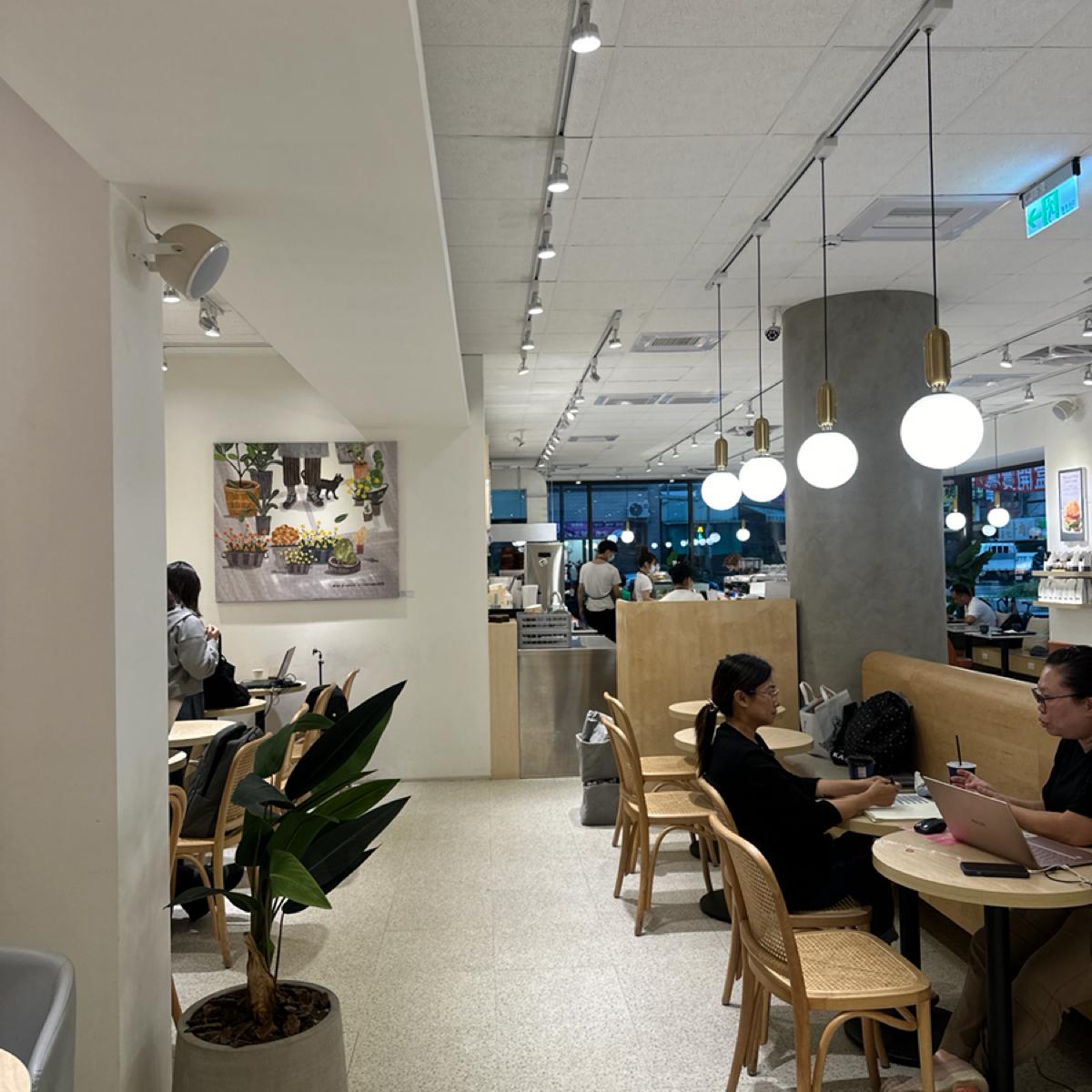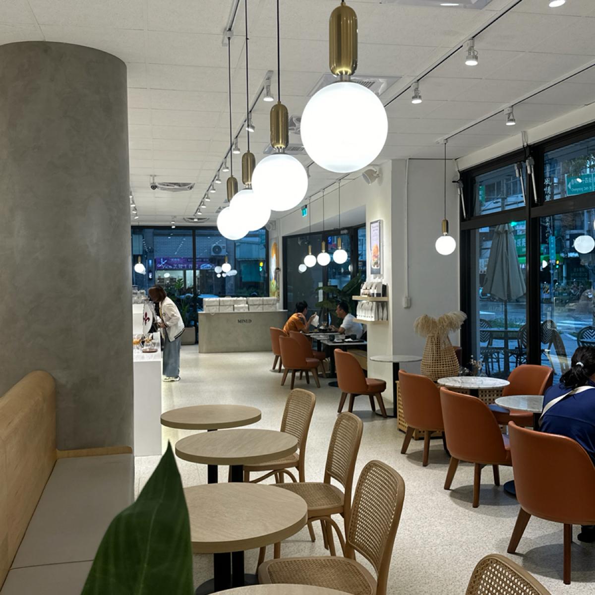 MINI.D Coffee 崇德館は東区で最も美しいカフェと言えるでしょう。三角形の窓の店舗で、大きな面積の床から天井までの窓が光をたっぷり取り入れています。コンクリートグレーの壁面と屋外の座席エリアが欧州の街角カフェの雰囲気を醸し出し、非常にリラックスできます。店内はシンプルなベージュトーンの装飾で、一部の座席にはコンセントがあり、壁には多くの絵が飾られています。球型のペンダントライトと編み椅子があり、全体の雰囲気は非常に落ち着きます。店内の座席は主に二人用の丸テーブル、壁際の丸テーブル(コンセント付き)、長方形の木製テーブル(コンセント付き)です。
