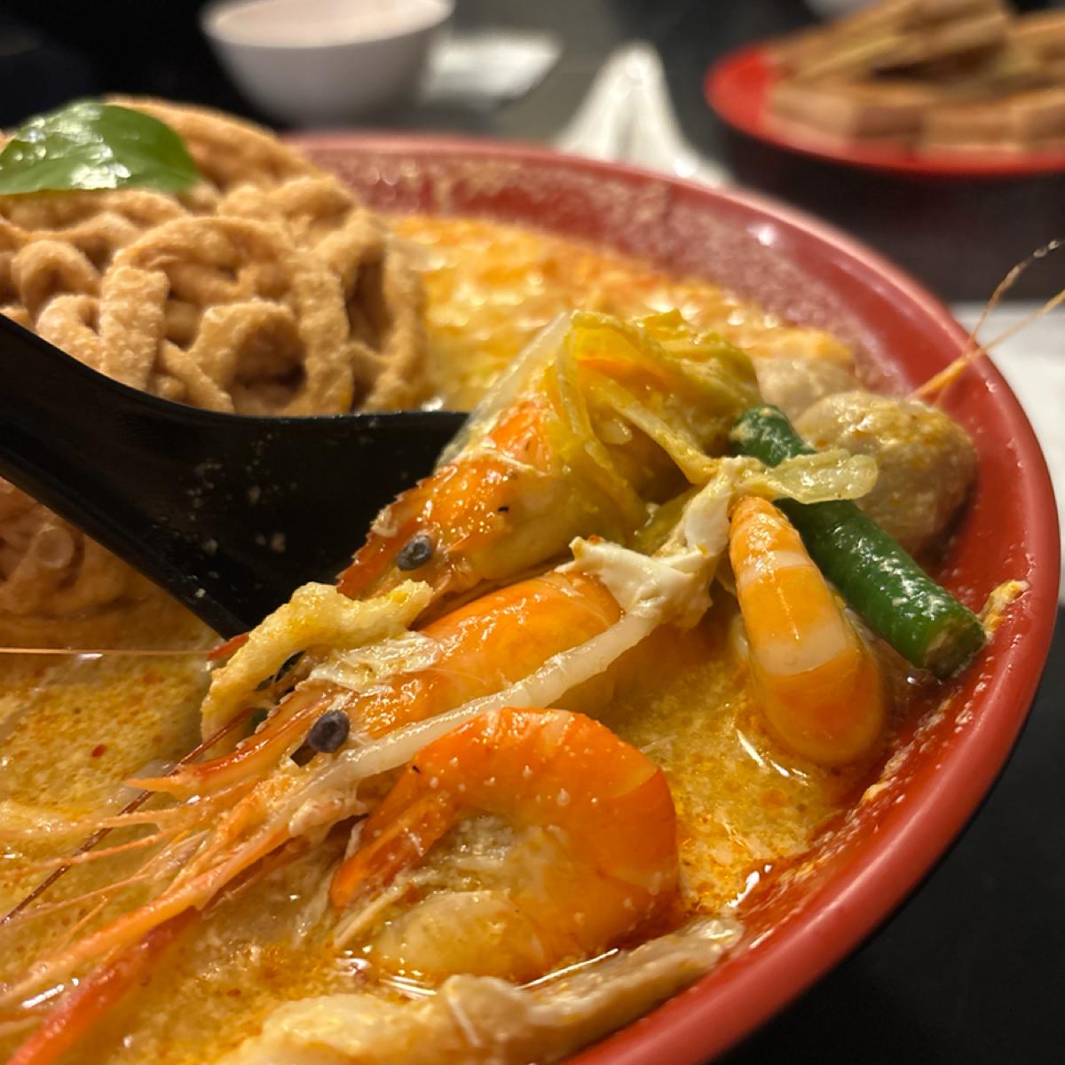• 海老味:海老のラクサ鍋焼きビーフンは贅沢な楽しみの名に恥じない一品です。一杯に7匹の海老が整然と剥かれ、甘みのある肉質がスープの熱気と共に匂い立ちます。特に注目すべきは、海老の卵と海老黄。この二つは視覚的にも驚き、口に入れると濃厚な海鮮の旨味が加わり、全体のラクサの香りがより立体的になります。