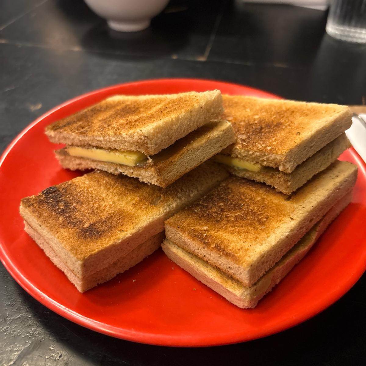 シンガポールのクラシックな美食の一つ!黒犬のカヤトーストは軽く焼かれ、外は香ばしく、内部にはたっぷりのカヤジャムと濃厚なバターが広がっています。塩味と甘味の層がゆっくりと口の中で溶け合い、カヤの特有の香りが一口ごとに感じられ、まさに止まらない美味しさです!