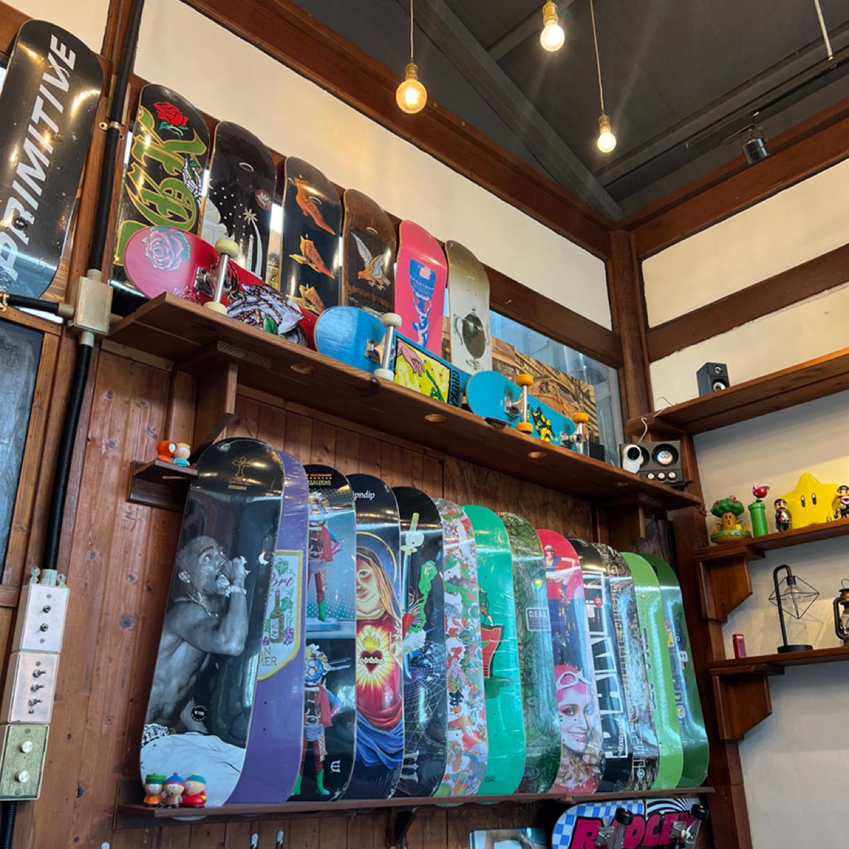 ドアを入るとすぐに、壁にスケートボードがずらっと並んでいるのが見えます。