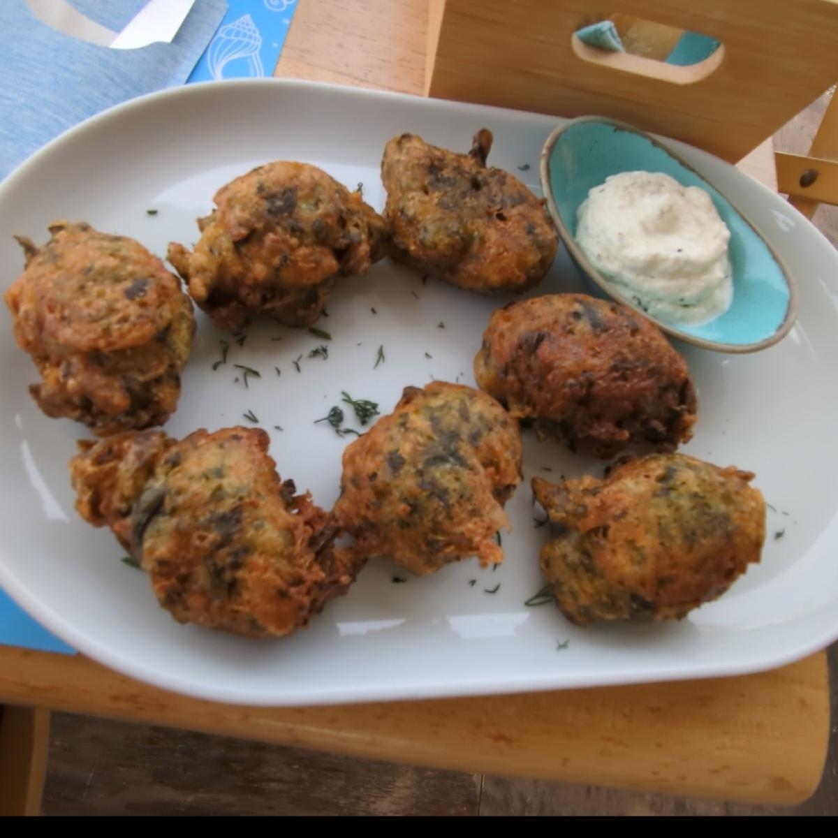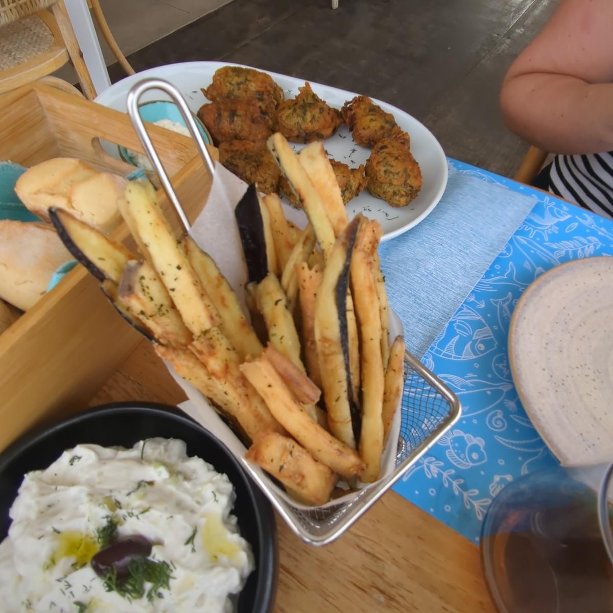 揚げズッキーニボール、タジキソースを添えたパン、ゴマと蜂蜜をまとったフェタ、アンチョビ、フライドポテト。