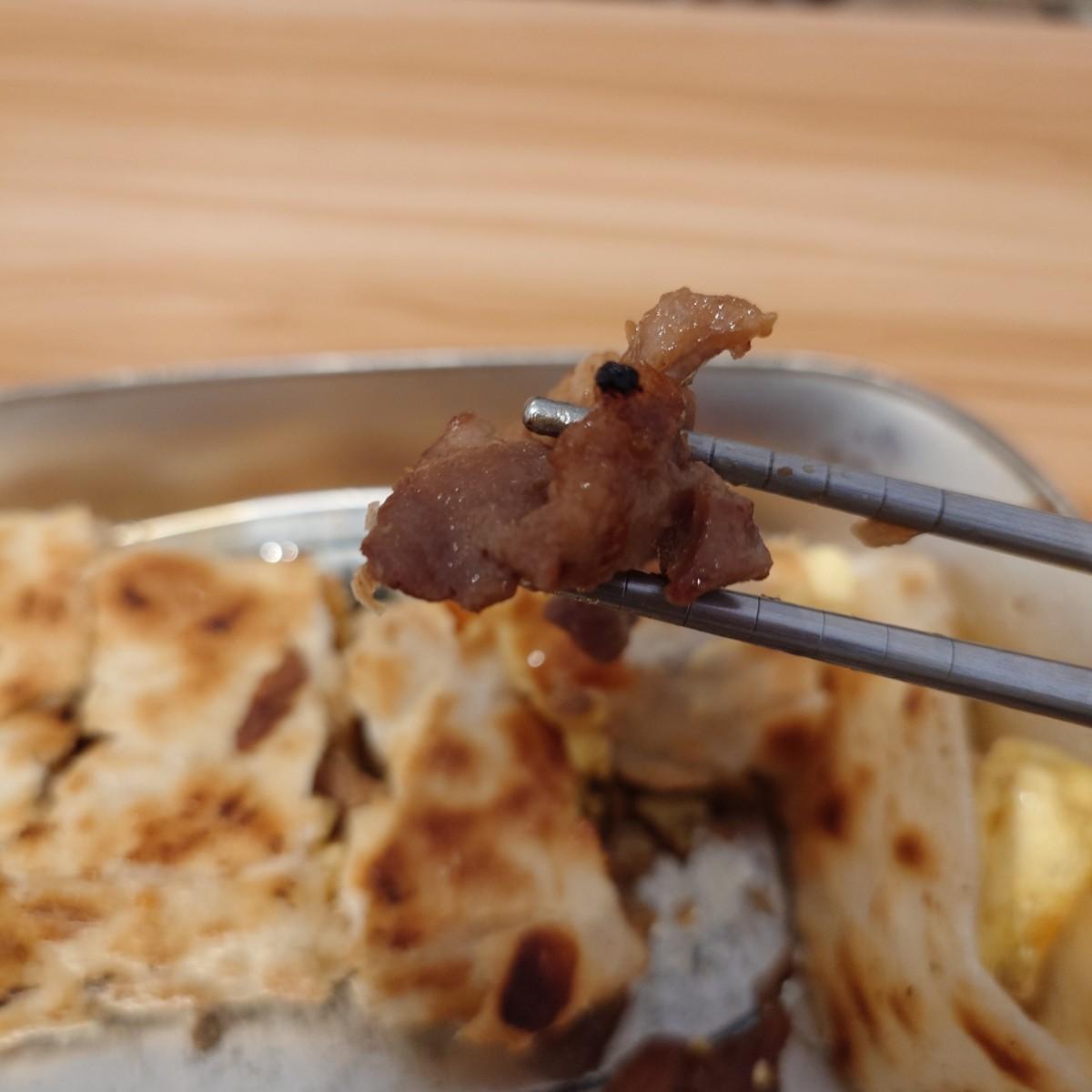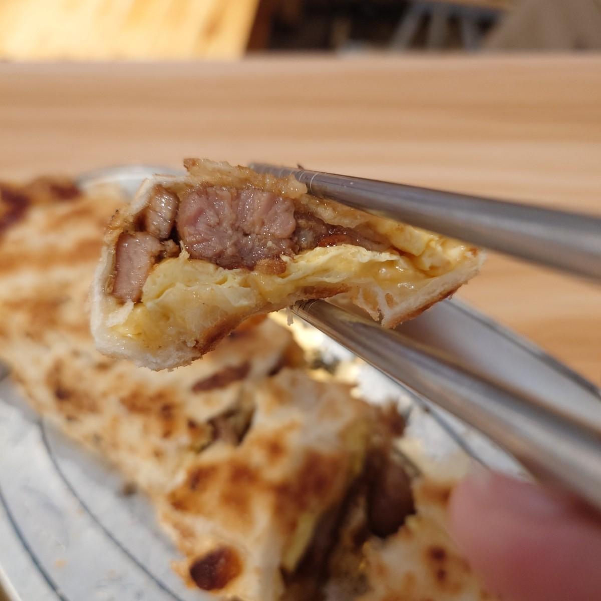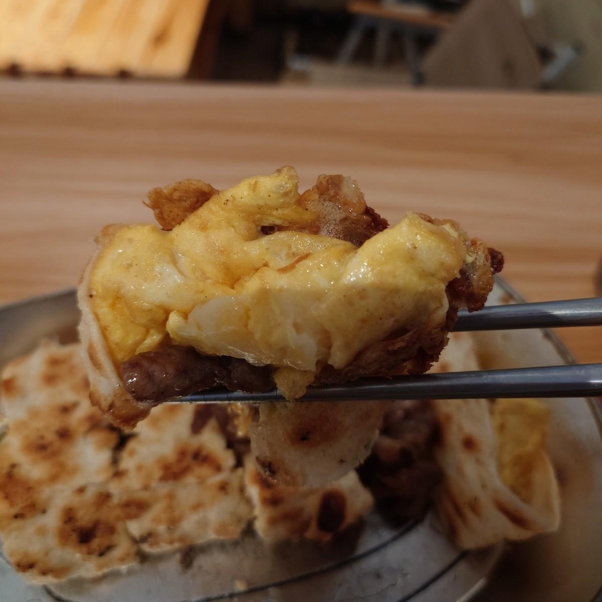 醤油焼きチーズ豚肉卵焼き、皮も豚肉も店主が自分で調合したもので、サクサクの食感が油っこくなく、パサパサでもなく、超薄いソーダクラッカーを噛むような感じ。卵はふんわりと仕上げられ、中には塩味のチーズが包まれ、自家製の豚肉スライスが合わせられています。サクサクと厚みがあって、なかなか良いです。