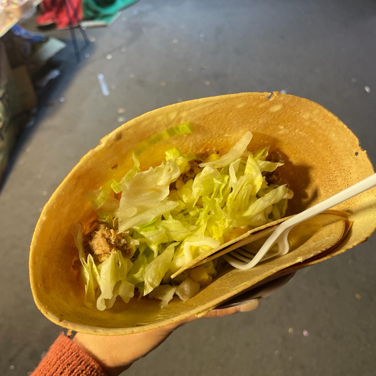 ツナサラダ - ツナの他に、スライスチーズ3枚、コーン、レタス、サラダドレッシング(マヨネーズ)が入っています。 クレープのツナは、具材を食べるのに便利なフォークを付けてくれます。 , しかし、レタスやマヨネーズと組み合わせるとかなり美味しくなります。塩味のクレープを食べたいなら、夜食として十分な量です。