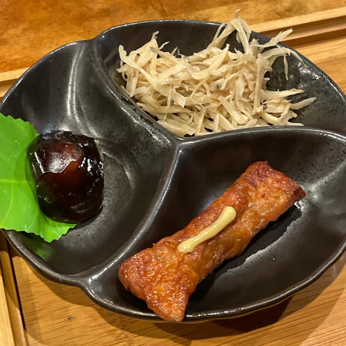 🔹副菜はエビ巻きと千切りごぼうです。エビ巻きはちょっと油っぽくて重いですが美味しいです!ごぼうの千切りには特徴がありません。