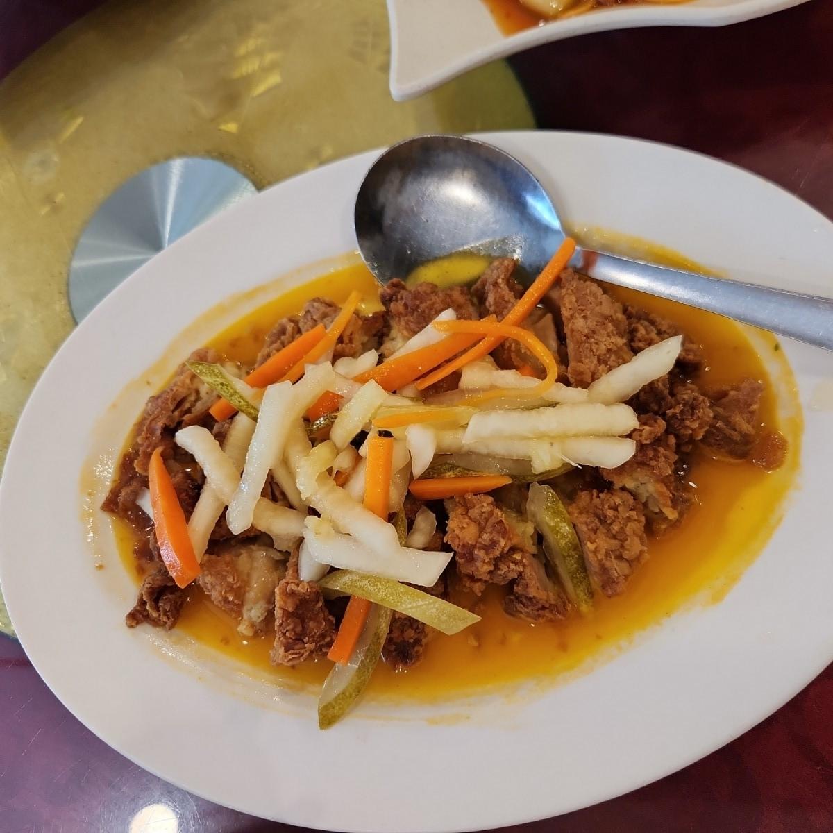 酢豚は、衣がサクサクで具材もしっかり入っていて、なかなか美味しかったです。他の料理は、まあまあといったところ。レモンチキンはレモン味があまりなく、食感も普通でした。塩コショウイカは、私の好みにはちょっと塩辛すぎましたが、イカは独特の衣でうまく調理されていました。ニンニク入りのベビーカイランは、特別な味はなく、普通でした。カボチャの豆腐は、ちょっと甘すぎましたが、普通でした。