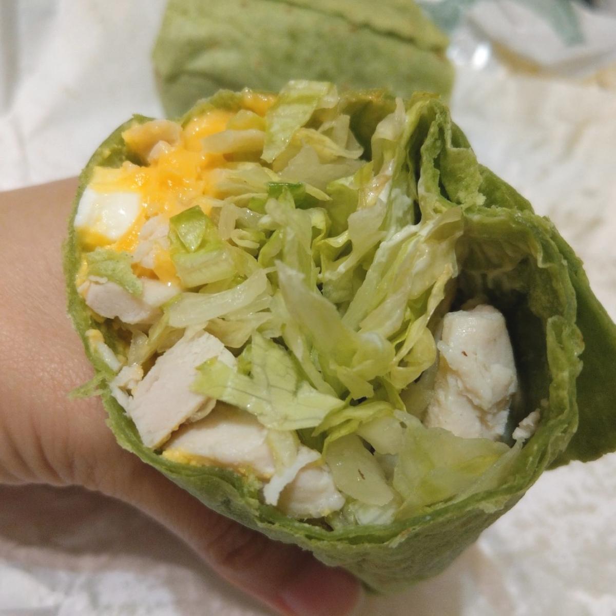 ラップの皮は緑色ですが、特別な味はなく、少し chewyで、具材を上手く包んでいます。具材は卵サラダ、柔らかい鶏肉、大量のレタスで、シンプルですがよく組み合わさっています。量は予想より多めで、個人的には気に入りました。パンに飽きたら試してみてください。