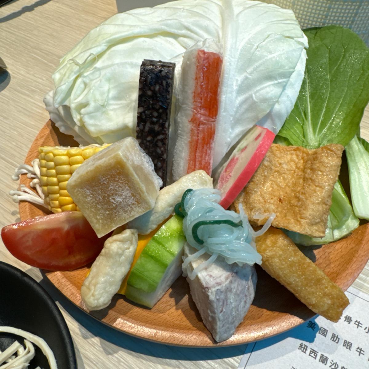具材はキャベツ、青菜、えのき、冷凍豆腐、ハーフコーン、トマト、ヘチマ、かぼちゃ、里芋、鍋の具材は取り出した状態で冷凍されているので中盛りです。長く調理してください。
