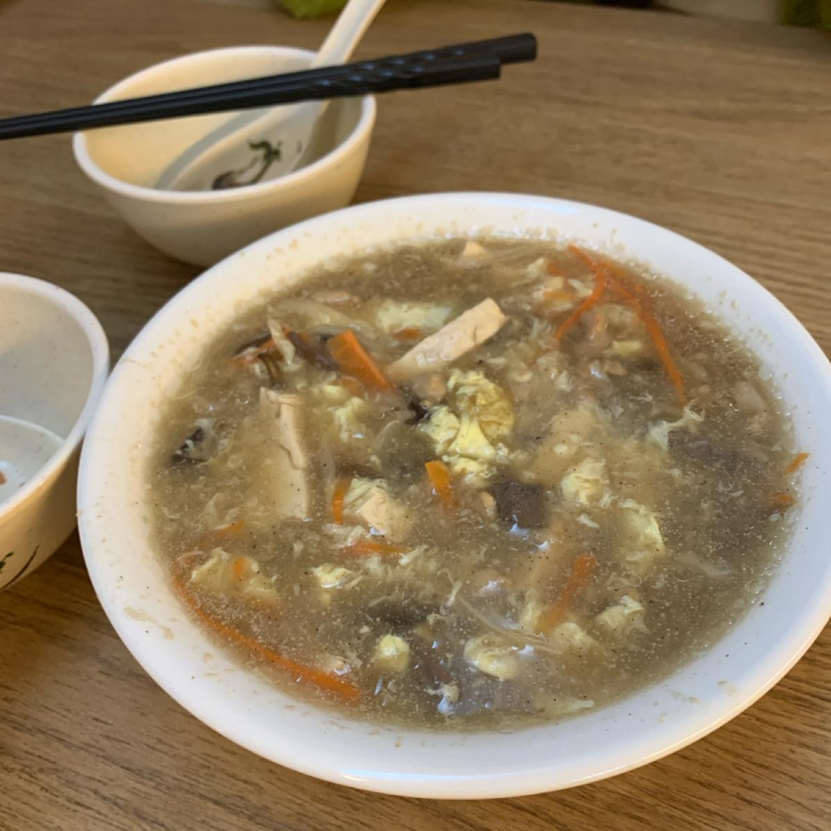 まずテーブルに運ばれてきたのは酸辣湯で、一口飲んでみると本当に酸っぱく、白胡椒が辛さを引き立てていて、味の表現が非常に良いです。