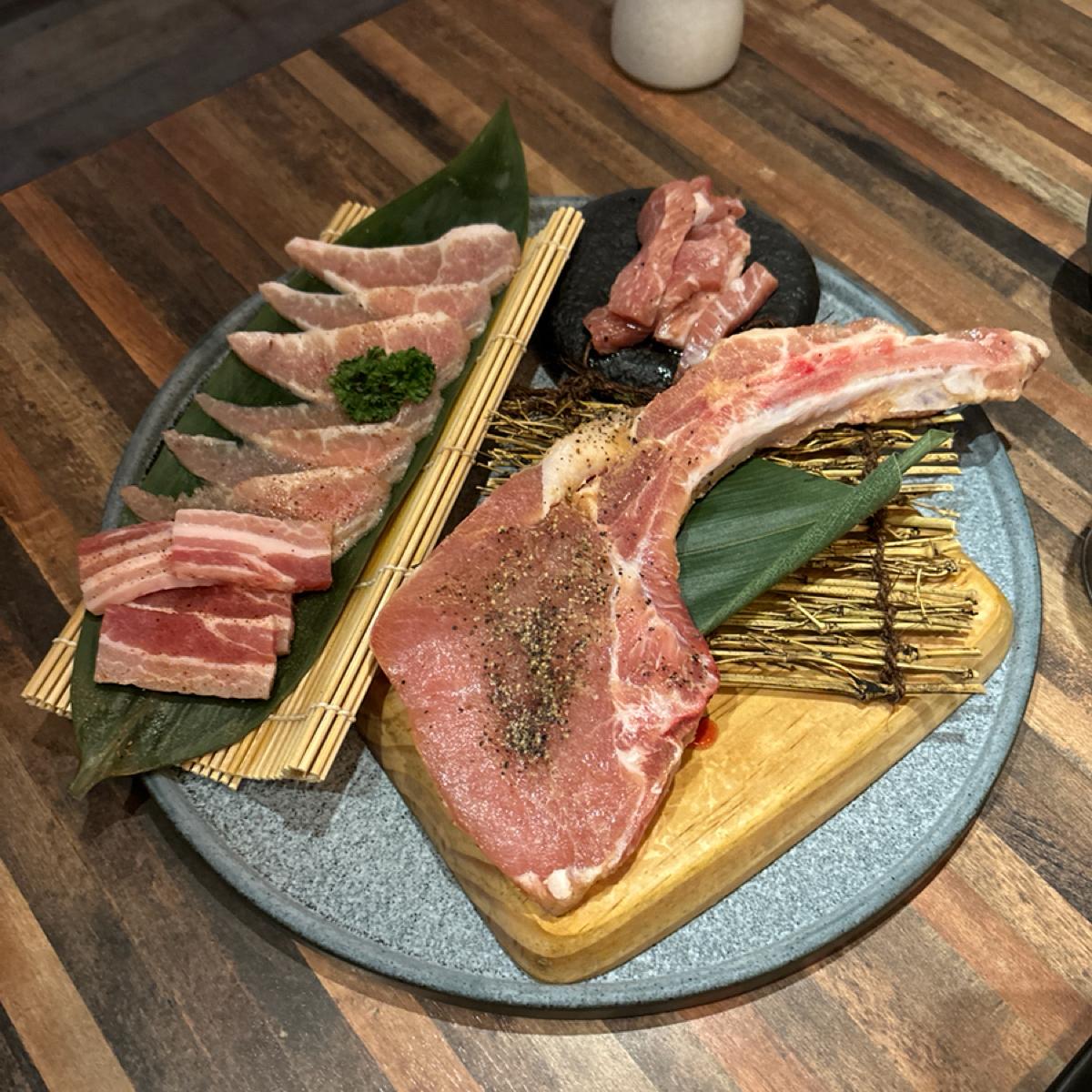 トマホーク豚 3 人分 + アラカルトのシーフードを注文